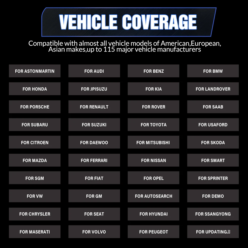 Для диагностики OBDII считыватель кодов obd2 отлично подходит для большинства автомобилей 1996 года и более поздней версии, совместим со следующими протоколами:-ISO 14230-4 (KWP2000)-ISO 15765-4 (CAN)-ISO 9141-2 (iso)-ISO 14229 (uds)-SAE J1850 (VPW и PWM)-Оригинальные протоколы производителей для расширенных функций, таких как активное тестирование, диагностика всей системы и обслуживание, он охватывает 95% моделей автомобилей, доступных на рынке, включая:-Азия: для Daewoo, для Honda, для JP Isuzu, для Kia, для Mazda, для Mitsubishi, для Nissan, для SGM, для Subaru, для Suzuki, для Toyota, для Hyundai, для Ssangyong-Европа: для Aston Martin, для Audi, для Benz, для BMW, для Citroen, для Ferrari, для Fiat, для Land Rover, для Maserati, для Opel, для Porsche, для Renault, для Rover, для Saab, для Seat, для Skoda, для Smart, для Sprinter, Для Volvo, VW, Peugeot-Америка: для Chrysler, USA-Ford, GM и продолжайте обновлять.