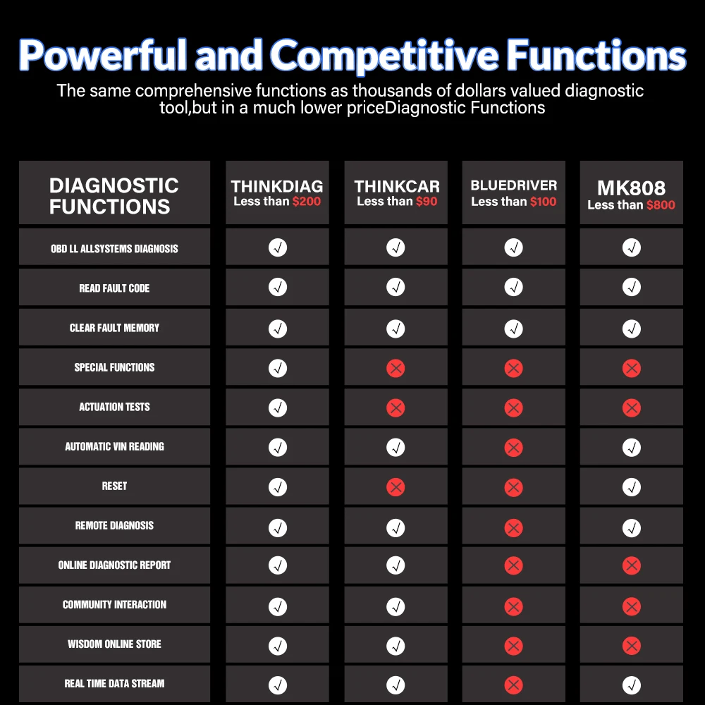 Thinkdiag может диагностировать электронную систему управления распространенными моделями Автомобилей, охватывающими Азию, Европу, Америку и Китай. Полный спектр моделей автомобилей и диагностика полной системы автомобиля делают его профессиональным автомобильным диагностическим инструментом. Включает: систему ABS, систему двигателя, систему SAS, систему TPMS, систему IMMO, систему аккумуляторов, систему обслуживания масла, систему SRS и т. Д. Функции диагностики включают: считывание кодов неисправности, очистка кодов неисправности, Считывание данных, тест активации, кодирование ECU и 16 специальных функций и т. Д.