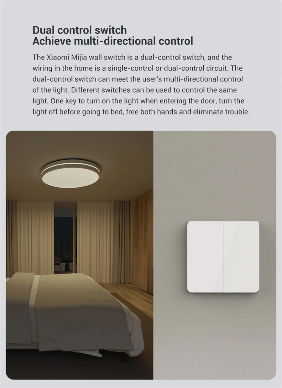 Настенный выключатель Xiaomi Mijia-это переключатель двойного управления. Его можно использовать с помощью домашней проводки с одним или двумя управляющими электрическими цепями. Переключатель двойного управления может соответствовать многопозиционному управлению лампой пользователем. Вы можете использовать разные переключатели для управления одной и той же лампой.