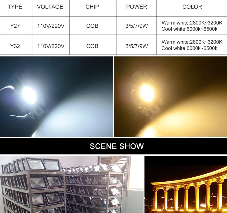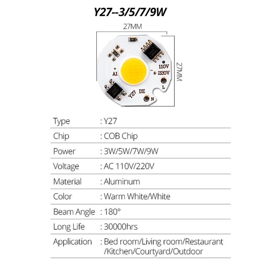 Описание продукта: Название: светодиодный чип COB Характеристики: Smart IC, не neet driver Напряжение: 220 В 110 В Мощность: 9 Вт 7 Вт 5 Вт 3 Вт Диаметр: 27 мм или 32 мм Светильник Цвет: Холодный белый: 6000-6500K Теплый белый: 2800-3200K Применение: прожектор DIY прожектор