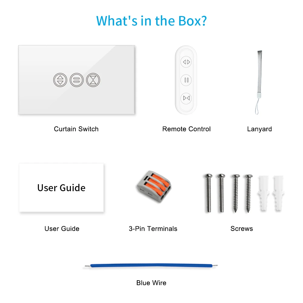1 * 3-кнопочный пульт N * RF & Wi-Fi Стандартный умный переключатель для штор стандарта США (количество зависит от вашего выбора) 1 * Руководство пользователя 1 * 3-контактный терминал в подарок для провода нейтральных линий 1 * синий кабель для установки на переключатель штор 4 * винты 1 * отвертка