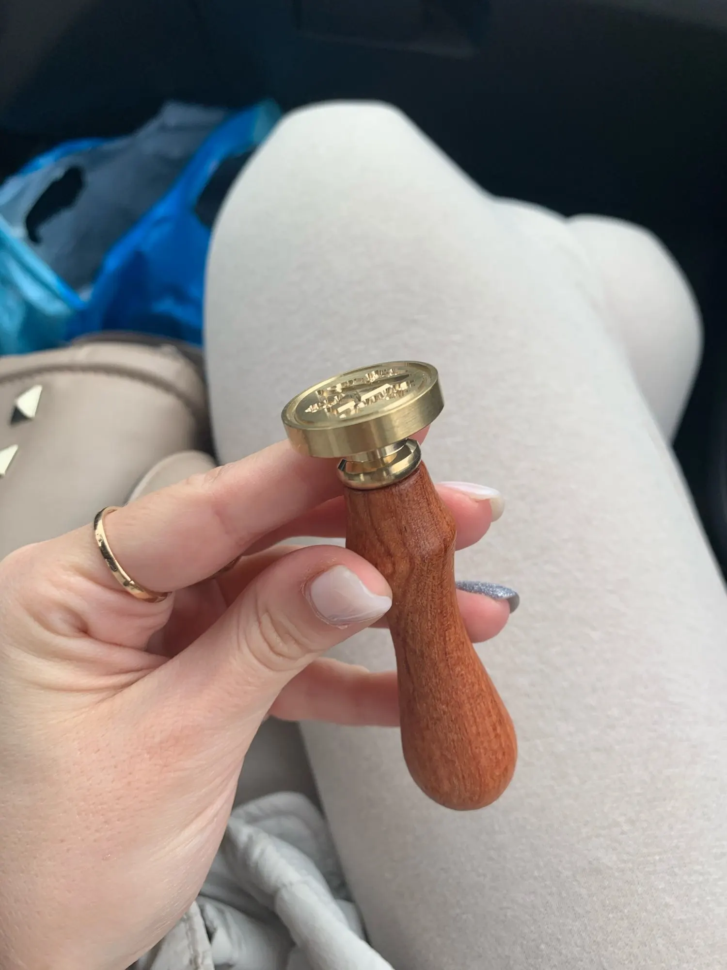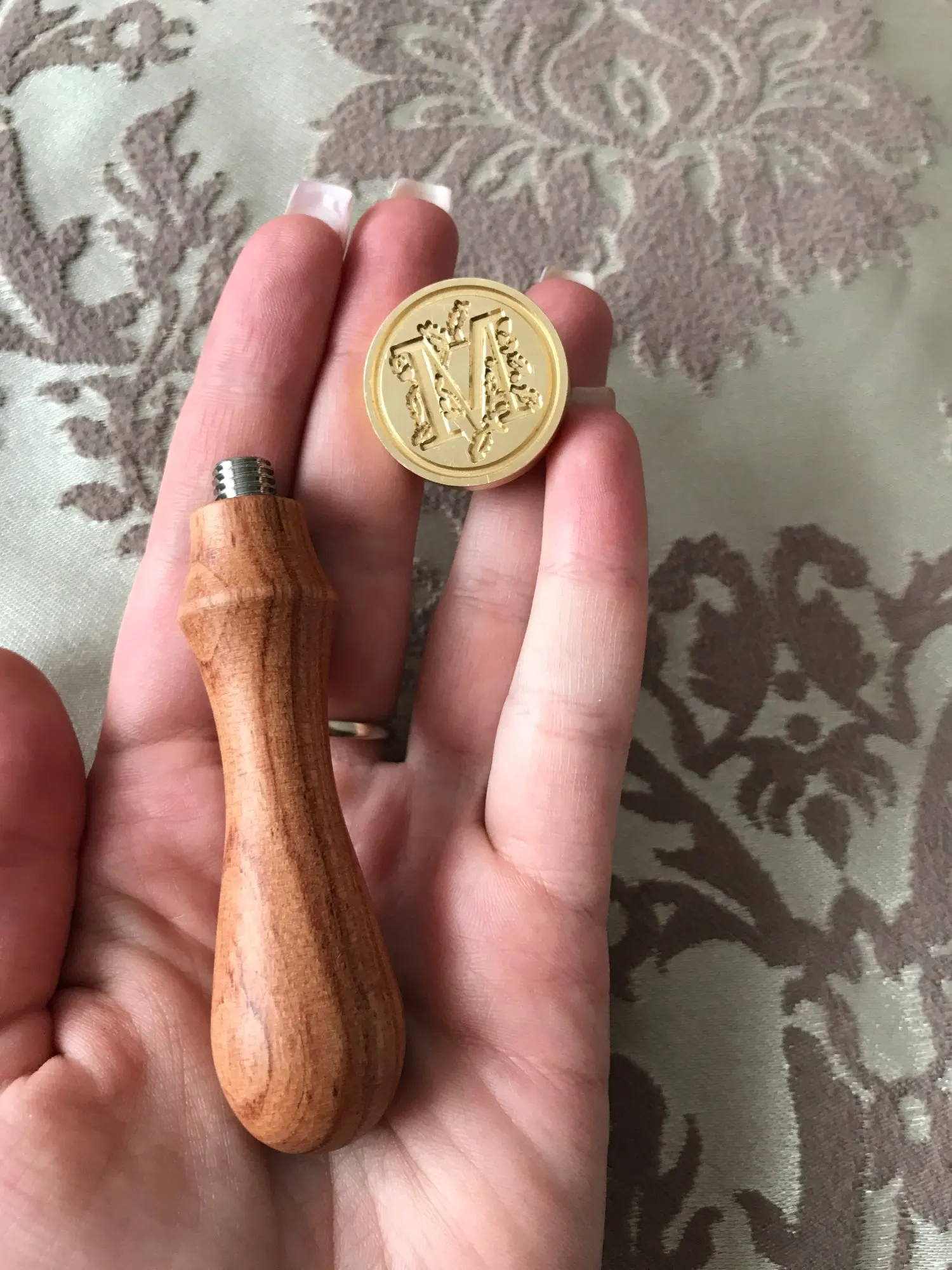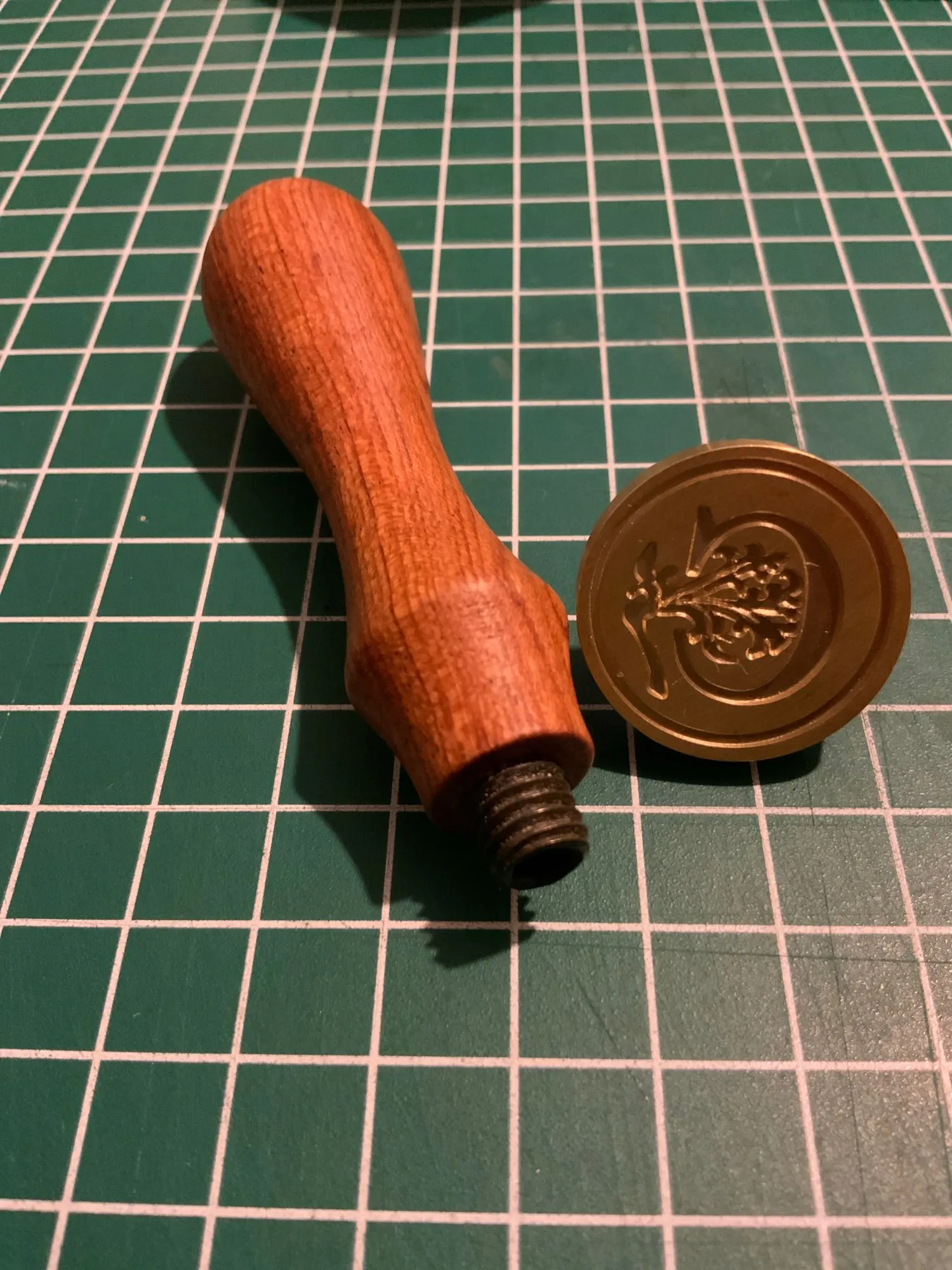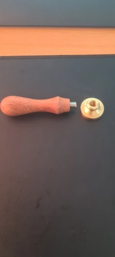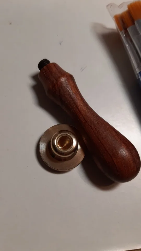 Деревянная ручка и латунная печать. Всё четко и соответствует описанию на 100%.