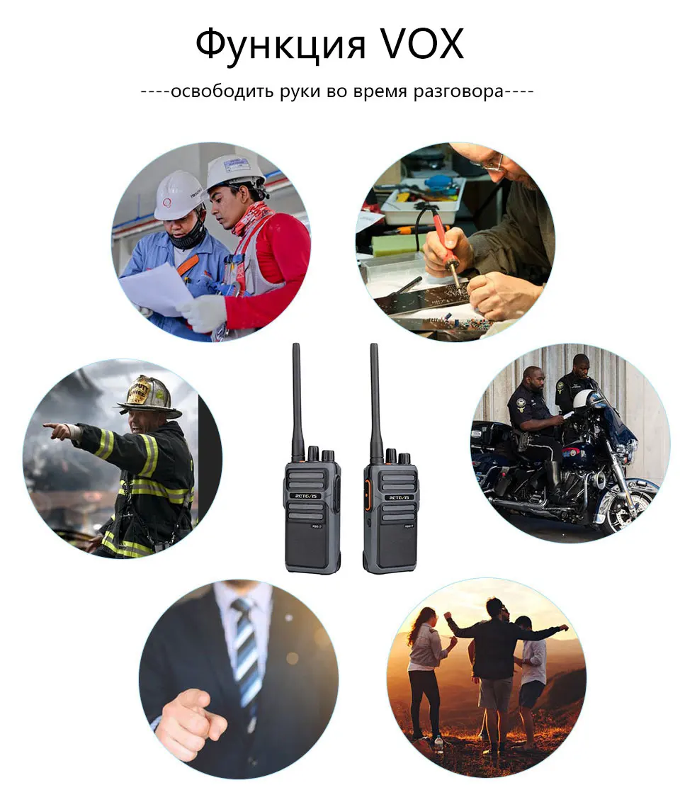 Функция VOX также называется Hands Free, разговаривая непосредственно с микрофоном RB17/RB617 walkie talkie без нажатия кнопки PTT. (необходимо активировать программным обеспечением программирования)