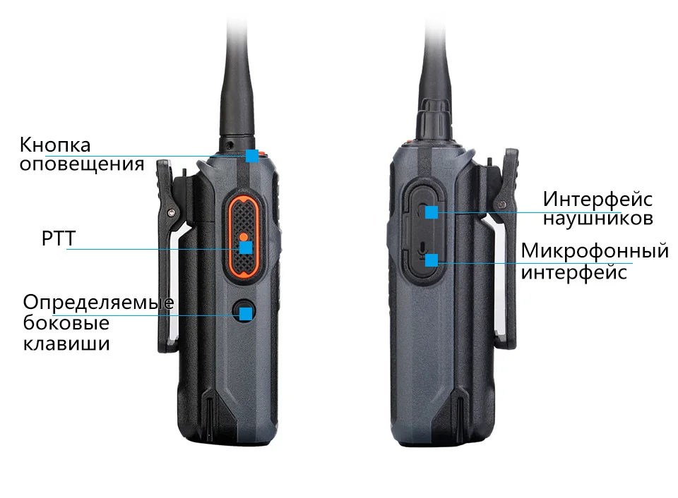 1. Индикатор2. Переключатель канала3. Выключатель питания4. PTT5. Монитор6. Уровень скважины7. TOT8. Сканирование9. CTCSS/DCS10. Голосовое оповещение11. Функция энергосбережения12. Оповещение о напряжении батареи13. Блокировка напряженного канала15. VOX17. Функция локальной сигнализации