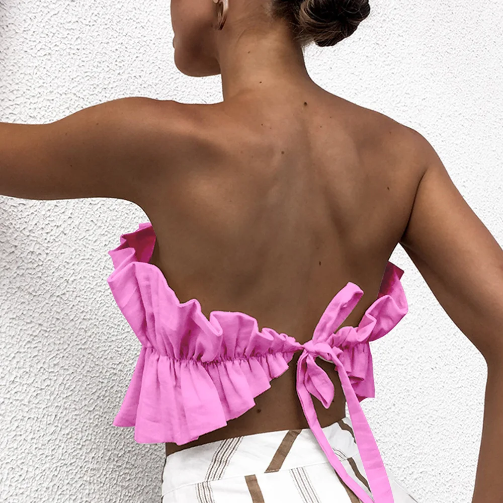 Женский укороченный топ с рюшами, майка с оборками без рукавов, пикантные топы с открытой спиной бандажный Топ, Бралетт, Клубная одежда, пляжная одежда, лето