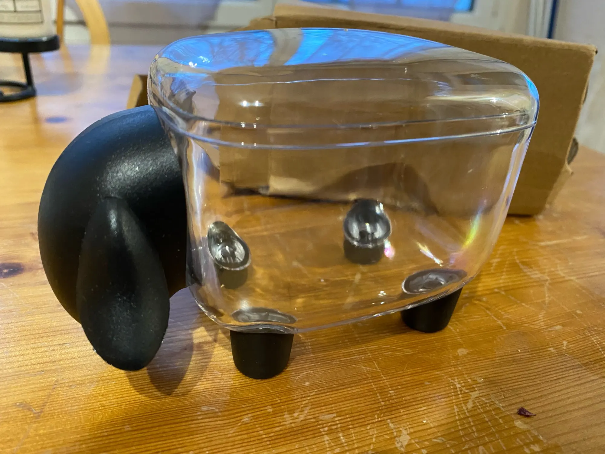 Продавец быстро отправил заказ. Коробка была плохо упакована, всего лишь в один пакетик, соответственно помялась в пути. На удивление, все осталось целым. Если присматриваться, сбоку она поцарапалась, но это не критично. Сама коробочка с крышкой и выглядит как на картинке) По размеру (сама коробочка без ножек): высота ~ 6,5см, длина ~ 9см, ширина ~ 6см, высота с ножками где-то 8см.