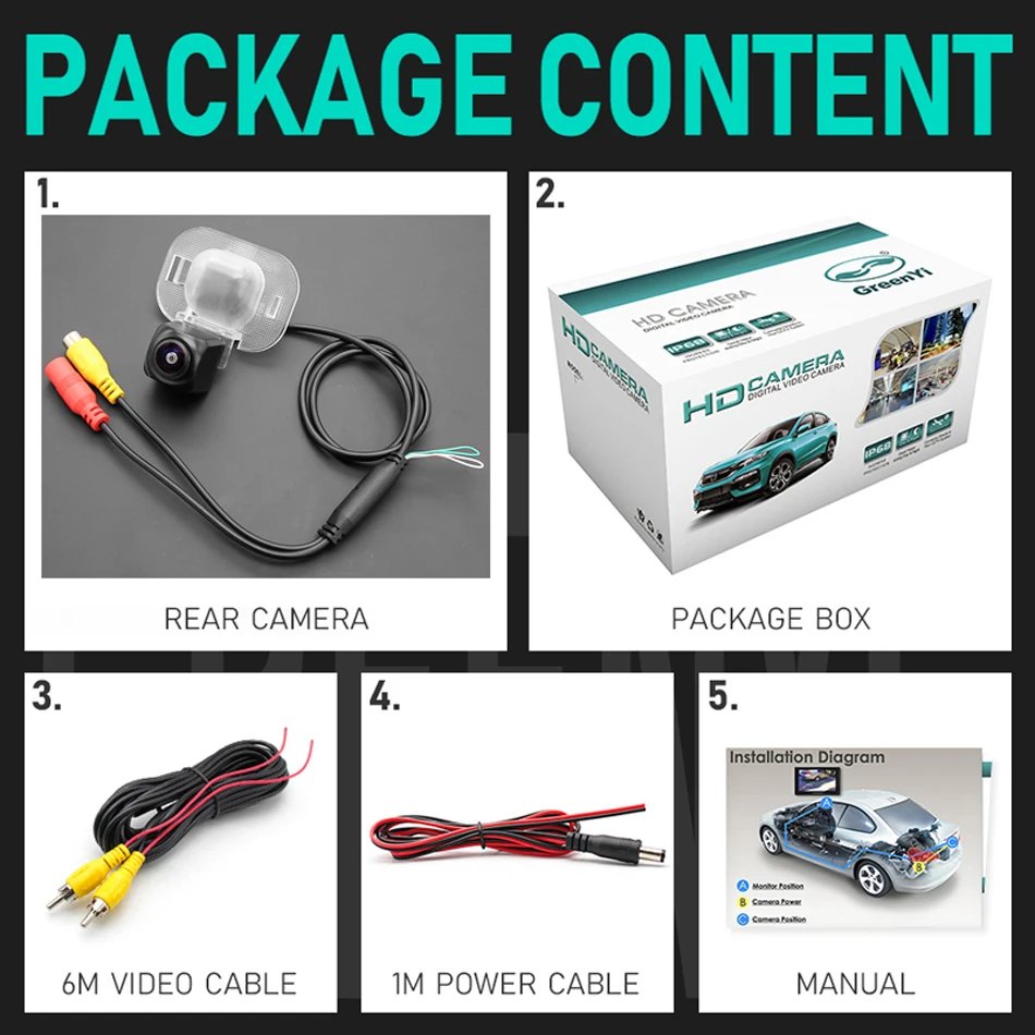 1.HD камера заднего вида2. Self-винт стук3. Видео кабель 6 м4. Кабель питания5. Руководство пользователя