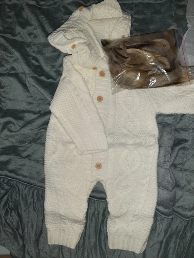 Здравствуйте, комбинезон получила, красивый, аккуратно сшит. Вязка плотная. Правда размер вы неправильный отправили. Заказывала два комбенизона этот на 18 месяцев отправили на 6, другой тоже получила на 6 месяцев. Звезду снимать не стала, качество хорошее.