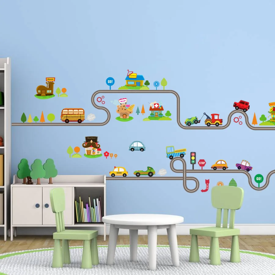Мультяшные автомобили, дорожные дорожки, наклейки на стену для детской комнаты, наклейки для детских игровых комнат, украшение для спальни, настенные художественные наклейки