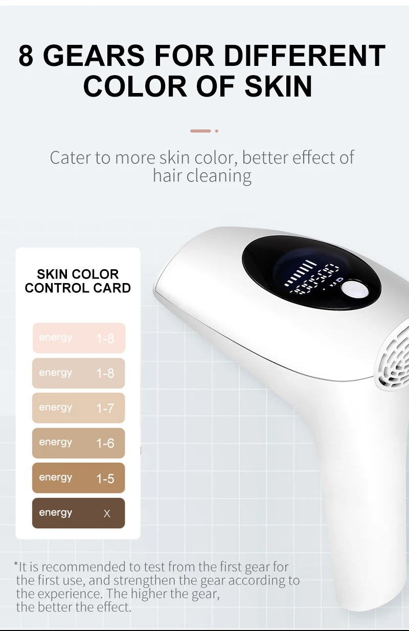 Время удаления волос: 999999 раз Размер продукта: 16,8*11,2*7,8 см Посылка включает в себя: адаптер, хост, руководство пользователя, бесплатный подарок (очки и бритва) Язык бумажного руководства: английский/русский/португальский/японский/французский/испанский/Корейский язык Уровни мощности: 1-8 уровней Основная функция: удаление волос Дополнительная функция: омоложение кожи, уменьшение акне Длина волны лазера: 500-1100mn Энергия: 3-5J/cm2 Использование шагов 1) сначала Подключите устройство к розетке и включите устройство; Выберите шестерню; Для первого использования рекомендуется медленно начинать с нижней части шестерни на соответствующую шестерню. 2) поместите лазерную головку на кожу, после того, как индикатор энергии вспыхивает, нажмите кнопку запуска, чтобы завершить работу; Переместите на следующую часть и продолжите работу. 3) После того, как токарная обработка на станке; Короткое нажатие выбросов кнопка для светильник выбросов операции, нажмите и удерживайте кнопку выбросов Кнопка автоматического или ручном режиме светильник выбросов переключения режима. Упаковочный лист