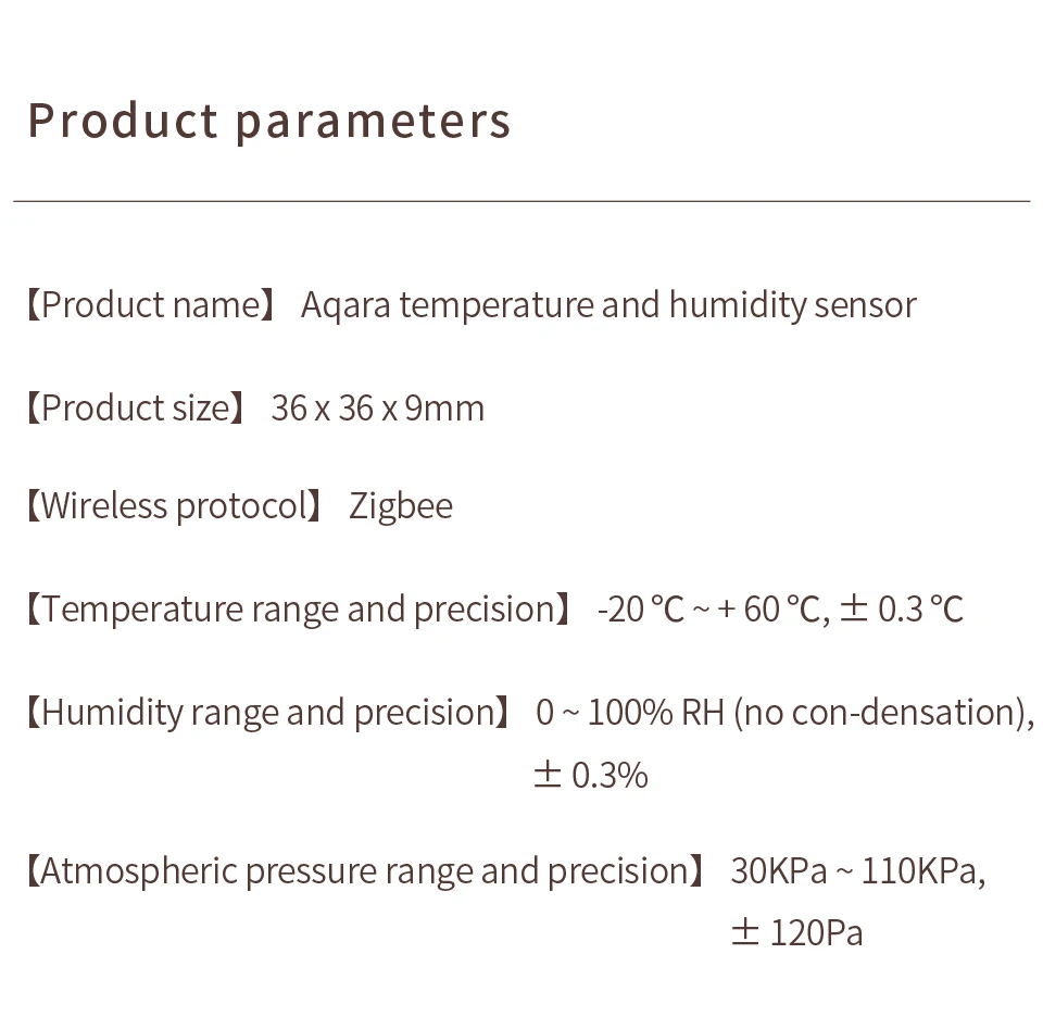 Draadloze verbinding: ZigBeeRecords в режиме реального времениMeerdere toepasing: kan om Aqara smart apparaten от andere ZigBee apparatenАвтоматическая сигнализация als de temperatuur, vochtigheid en atmosferische druk abnormaal zijnDeteteert de temperatuur, vochtigheid en atmosferische druk staatДверь Aangedreven een CR2032 knoopcel (inbegrepen)Загрузите приложение «Mi Smart Home» van de Appl e Store of Google PlayTemperatuur detectiebereik: -20 - 60 Graden C ( + / -0,3 Deg.C)