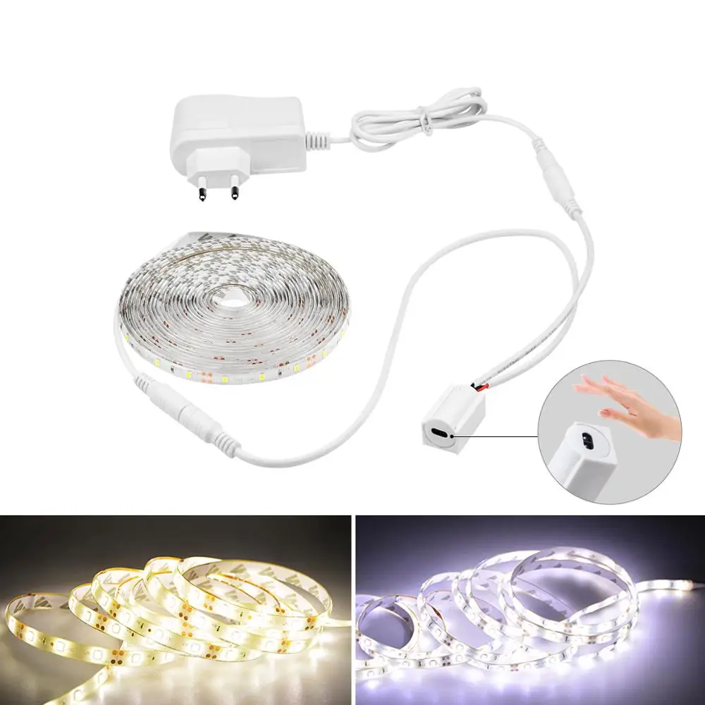 Тип переключателя: ручной переключатель датчика разверткиЦвет освещения: белый/теплый белыйЦветовая температура: теплый белый (2800K-3000K)/белый (6000K-6500K)Тип светодиодов: 2835SMDДлина: 1 м/2 м/3 м/4 м/5 мНапряжение: DC12VАдаптер питания: штепсельная вилка ЕС/СШАРасстояние обнаружения: 2-5 смCRI:>85