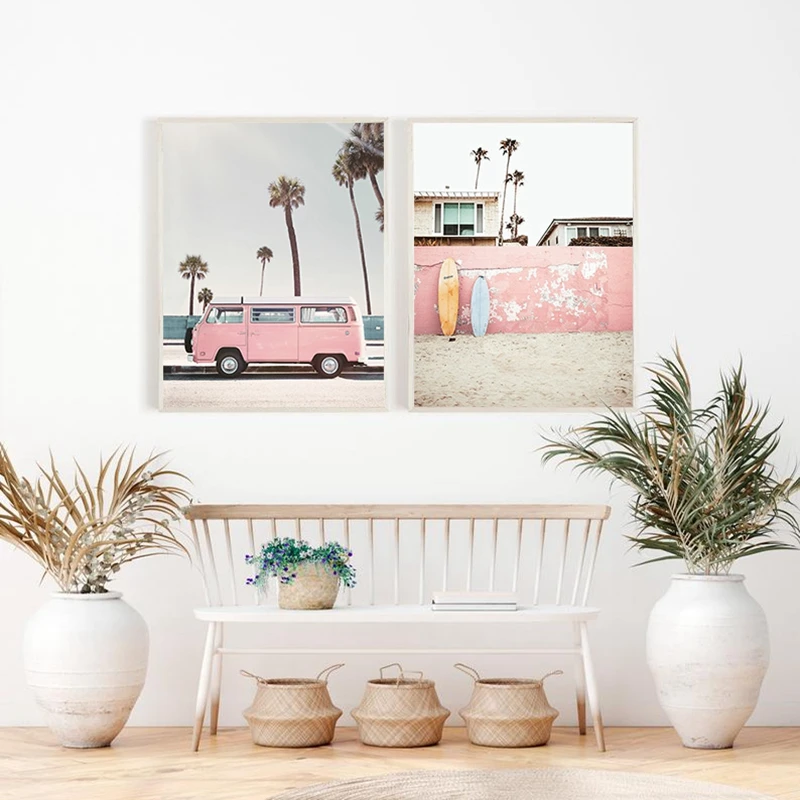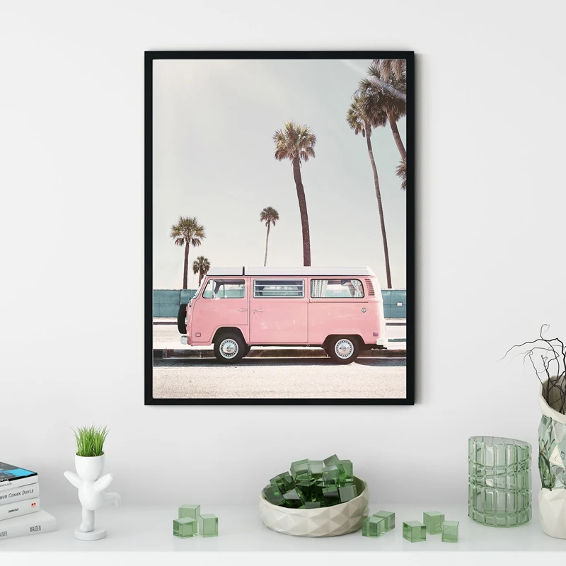 Настенный постер в стиле ретро с изображением розового фургона