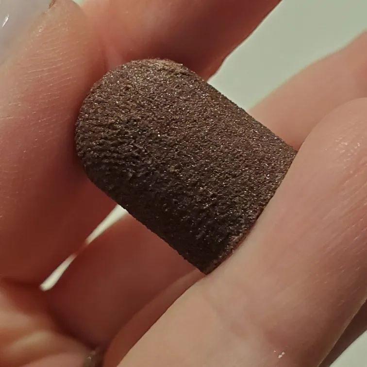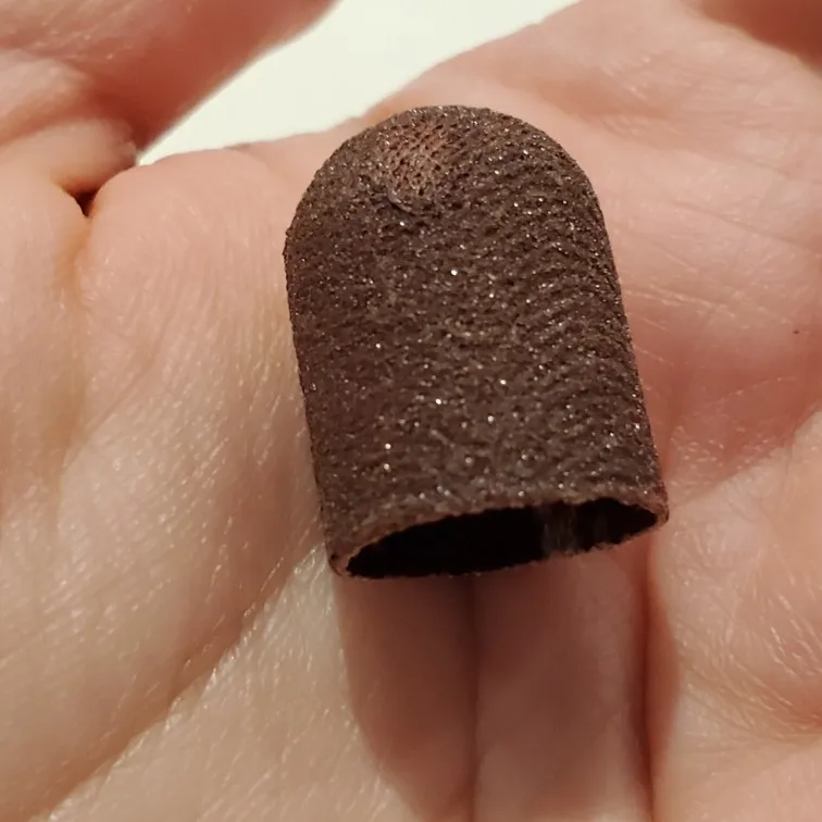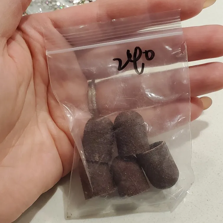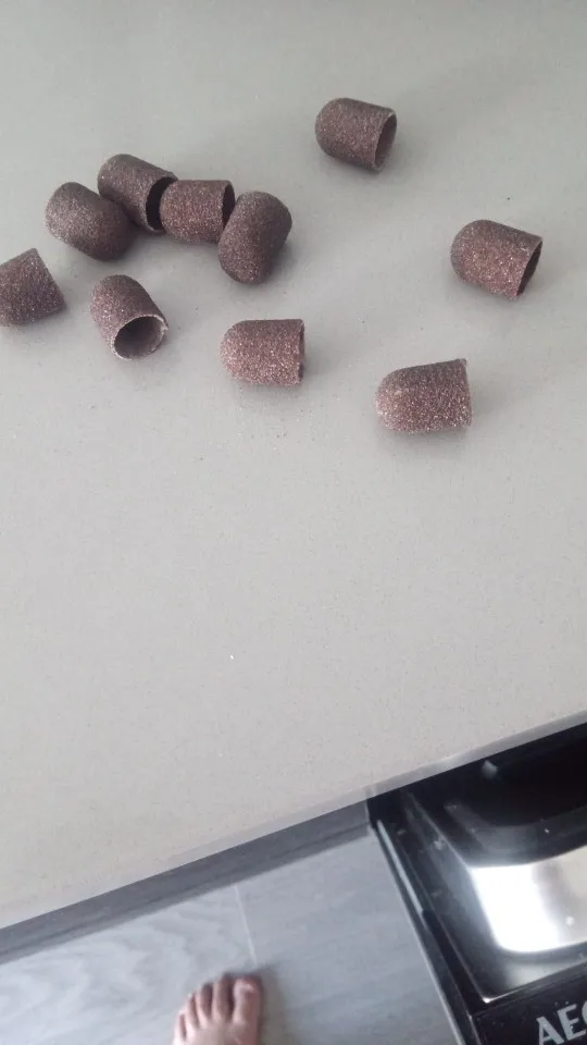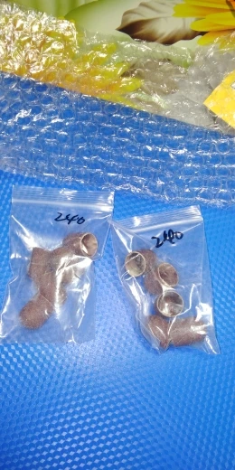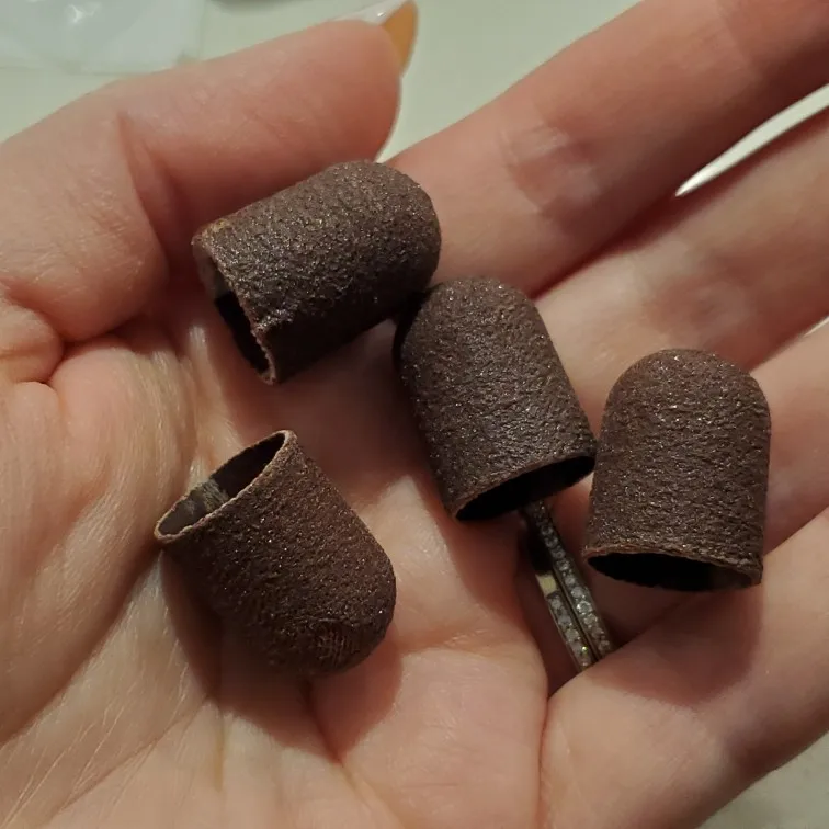 пришли быстро, заказывала 10 шт. пришли только колпачки. в моем случае сама насадка не шла в комплекте, обращайте внимание на это, когда заказываете. постаралась близко сфоткать, чтоб было видно абразив 240 грит. по мне так для 240 грит грубоваты колпачки.