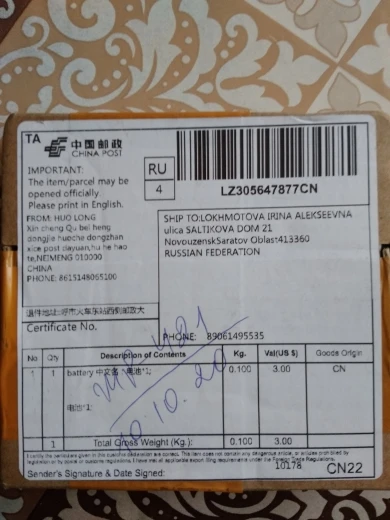 Аккумулятор шел очень-очень долго, 63 дня... но ладно хоть дошел... спасибо, продавцу!