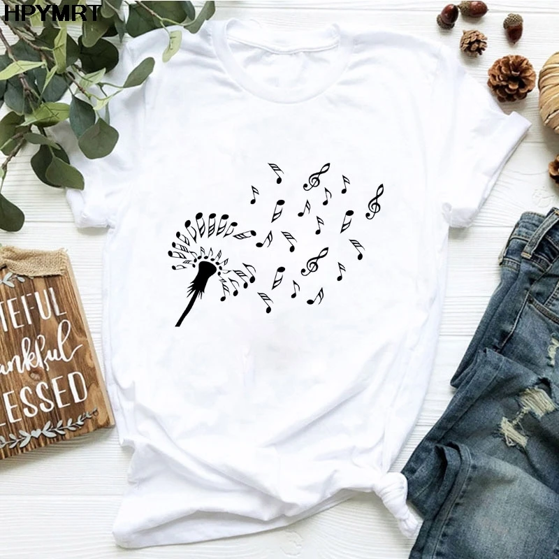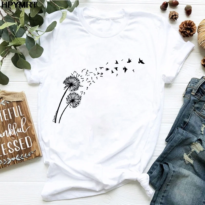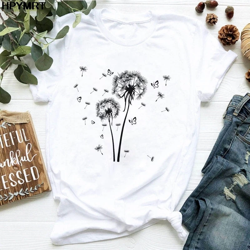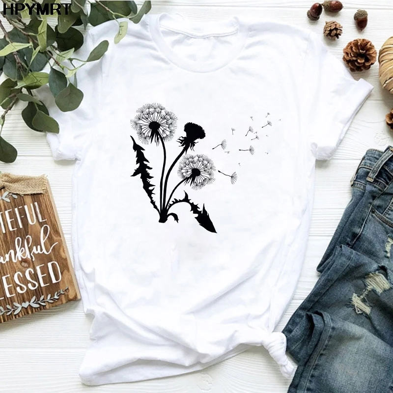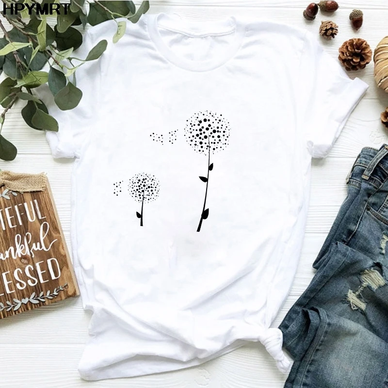 Футболка женская с принтом одуванчиков и букета, Повседневная Свободная белая рубашка с коротким рукавом и круглым вырезом, Топ в стиле Харадзюку, на лето