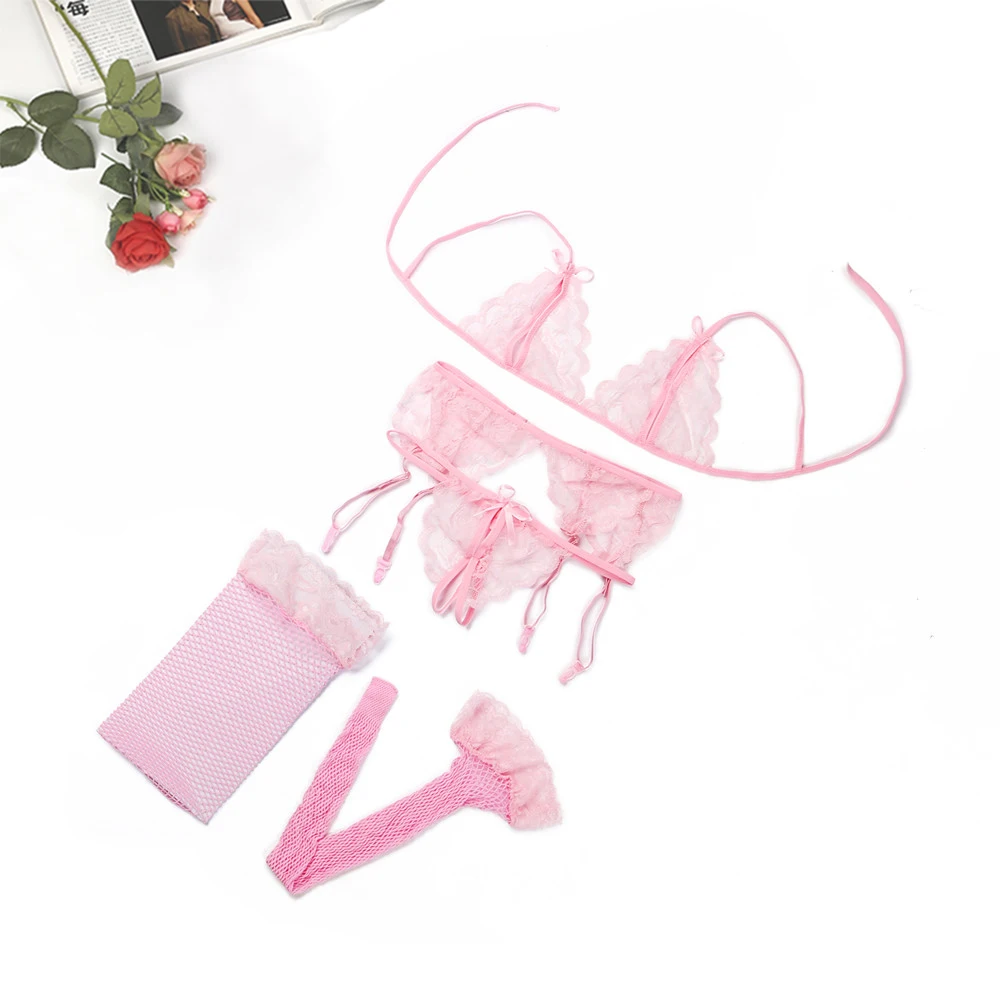 Комплект женского кружевного нижнего белья, прозрачный бюстгальтер, трусики, подвязки и сетка, размера плюс, 4 шт.комплект, чулки сексуальное женское бельё