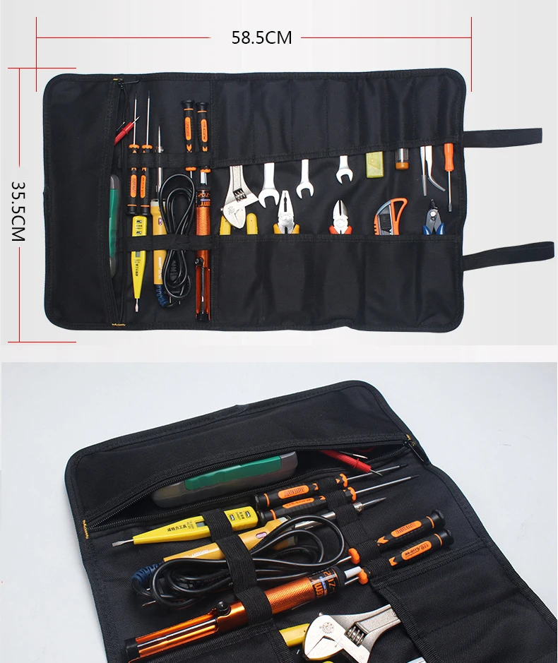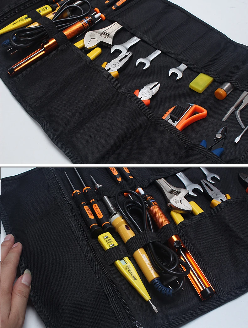 Наименование: рулонный набор инструментовМатериал: 600D ткань ОксфордТип: катушкаРазмер: 585*355*5 ммХарактеристики: 22 кармана + 1 сумка на молнииХарактеристики: износостойкий и водонепроницаемыйОсновные виды применения: инструменты для технического обслуживания, хранение аппаратных средств и т. Д.