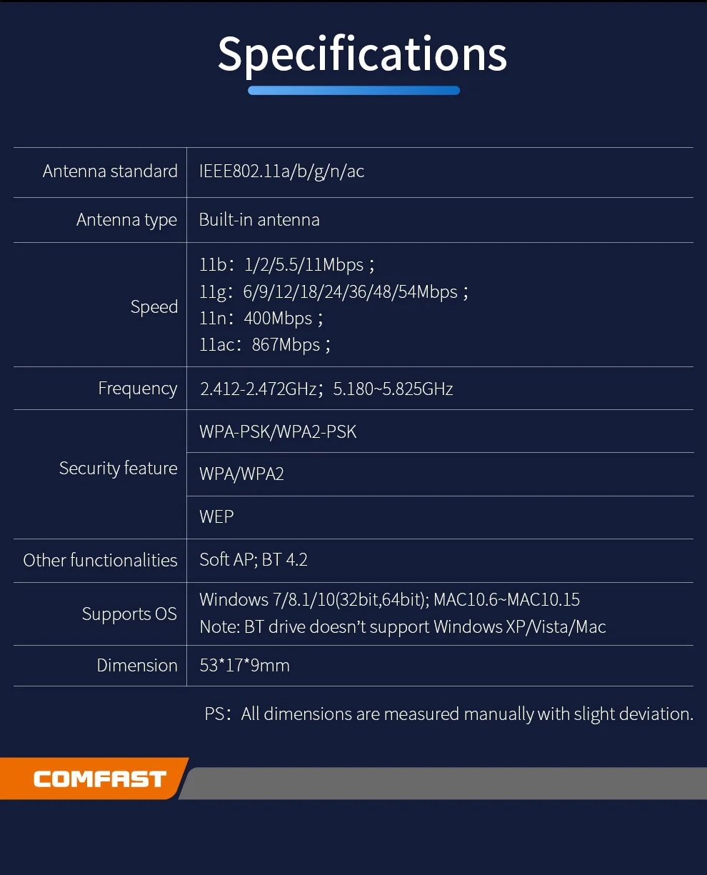 4. Частота беспроводной связи: Wi-Fi: 2,412 ~ 2,484 ГГц, 5,180 ~ 5,825 ГГц