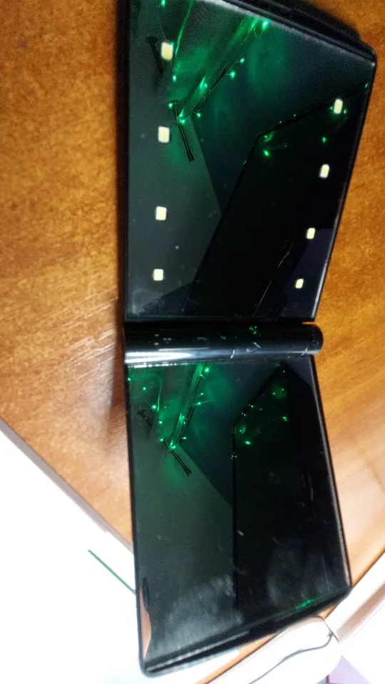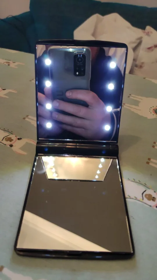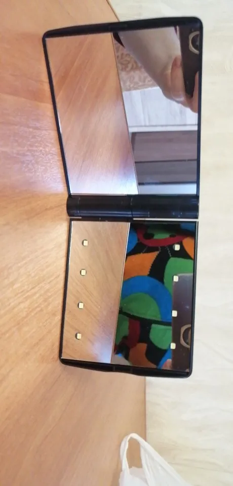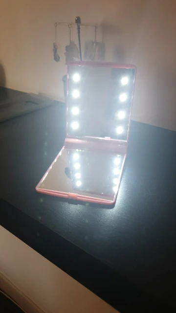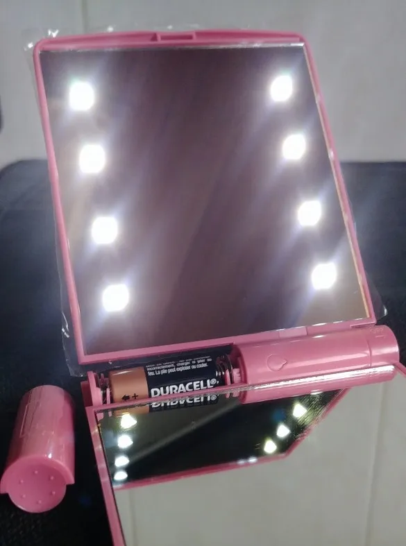 Хорошее, удобное, вариант для сумочки, размером с ладонь. 2 зеркала :одно с подсветкой, другое без. Пришло без батареек и не понятно какие надо. Единственное, заказала белое, а пришло чёрное. Чёрное не советую, на глянцевой поверхности сильно видны следы пальцев. Придётся подобрать чехол.