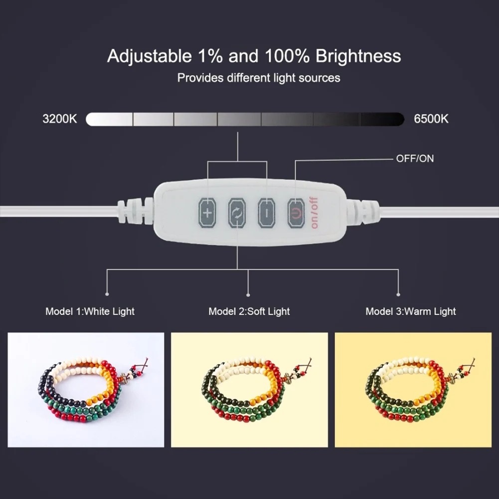 Особенности1. Светильник для фотосъемки предназначен для небольших предметов для любителей фотографии, ремесленников, художников, продавцов etsy и других онлайн-продавцов, профессионалов и клиентов по рекламе продукта.2. Светильник-бокс-студия позволяет быстро и легко снимать мелкие товары, такие как ювелирные изделия, аксессуары, игрушки, часы, гаджеты и другие предметы.3. Соберите свою собственную фотостудию в любом месте в течение нескольких минут, вы можете развернуть этот светодиодный лайтбокс-студия и разместить его на любой поверхности, чтобы получить идеальный фон для фотосъемки небольших предметов, фотографирования продуктов.4. Портативный складной дизайн цепи пряжки, более удобный для установки и переноски, Встроенный светодиодный светильник, обеспечивающий средний Светильник, предотвращает появление теней и отражений на фотографиях.5. С 6 фоновыми прокладками, встроенный кольцевой светильник и usb-кабель. Три цвета переключатель температуры.Характеристики кольцевого светодиодный1. Количество бусин: 64 шт.2. Модель лампы: 28353. Яркость лампы: 24-26лм4. Белый светильник, цветовая температура: 6500K5. Теплая белая цветовая температура: 3200K6. Мощность: 7-14 Вт7. Напряжение: 5 В8. Указывает: Ra>829. Диапазон затемнения: 1%-100%10. Источник питания: порт USB11. Длина кабеля: 2 м