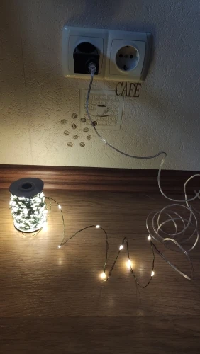 отличная гирлянда. можно запитывать на несколько часов от небольшого павербанка и не тянуть до розетки. проволока достаточно жесткая чтобы держать фотму при размотке из бухты, поэтому пришлось использовать грузики для натяга. на фоне окна вечером отражение визуально увеличивает количество огоньков. выглядит очень уютно и мило.