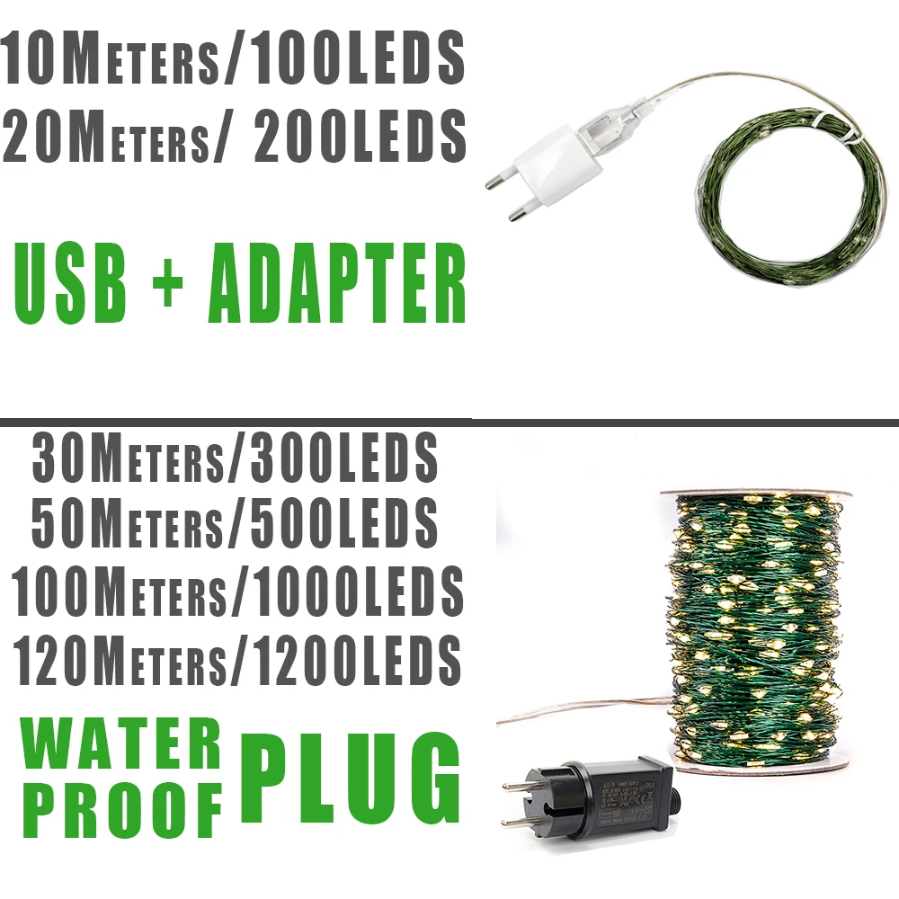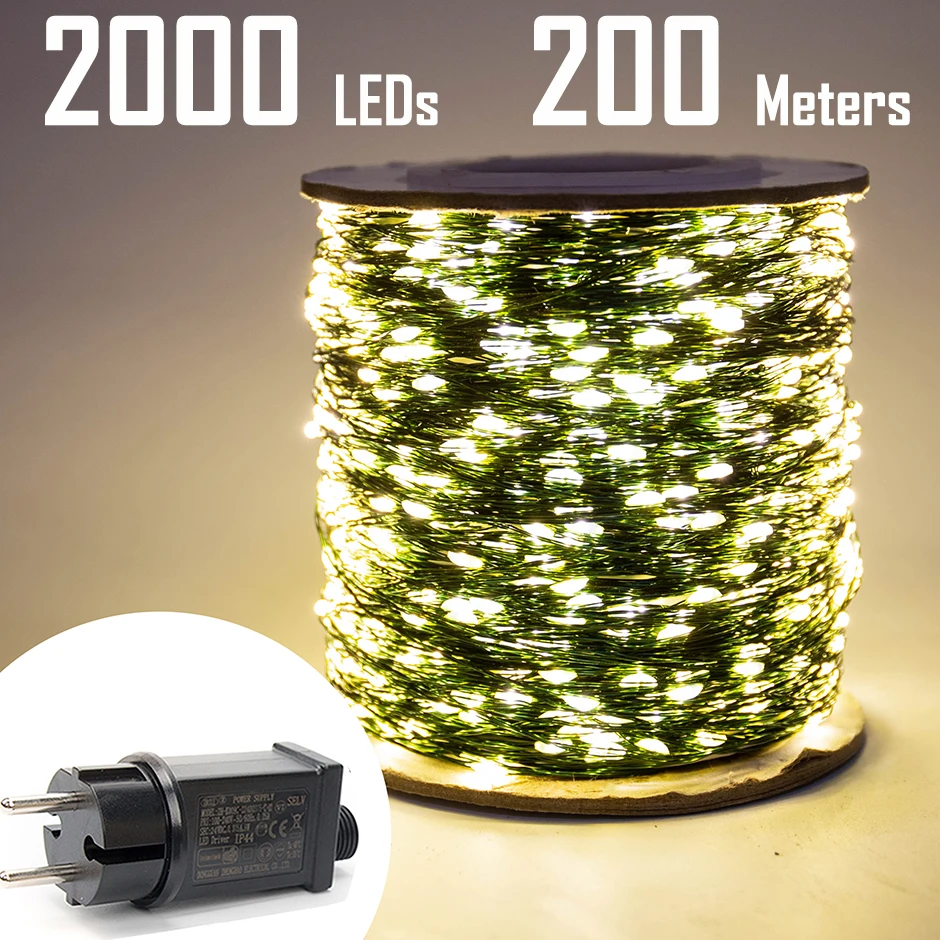 Уличная светодиодная гирлянда 200 м, 100 м, 50 м с зеленым проводом, праздничная Водонепроницаемая сказочная гирлянда для рождественской елки, украшение для свадебной вечеринки