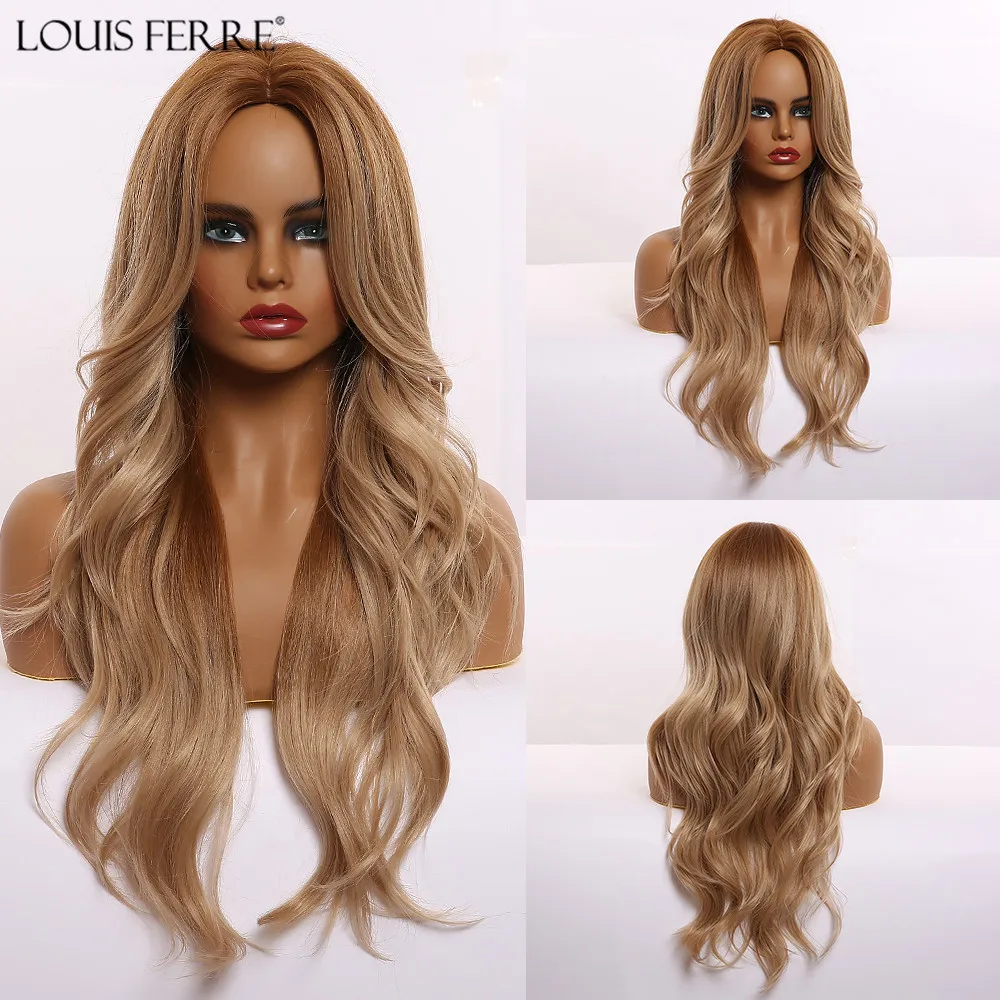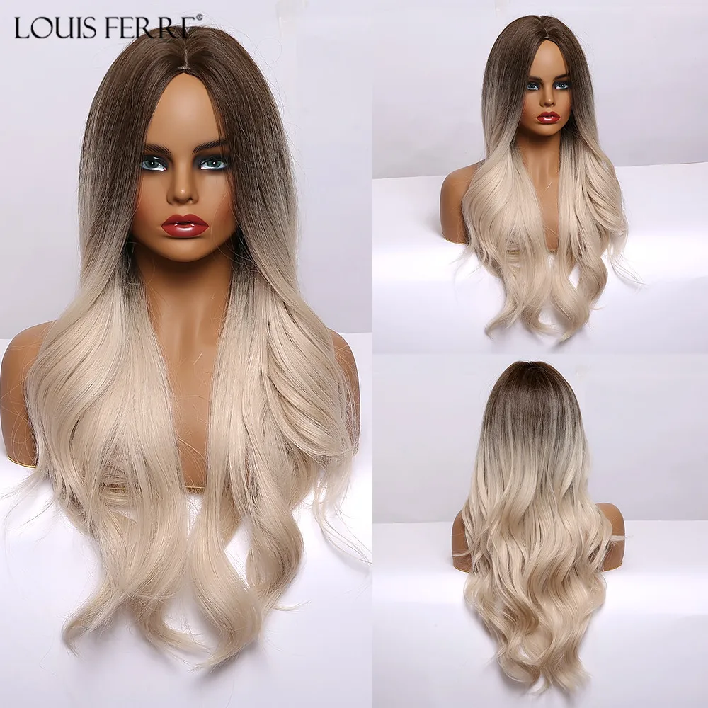 Луи Ферре длинные водяные волны Платина синтетические парики для женщин высокая температура поддельные волосы Косплей блонд парики с коричневым корнем