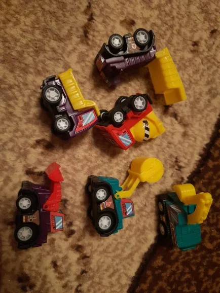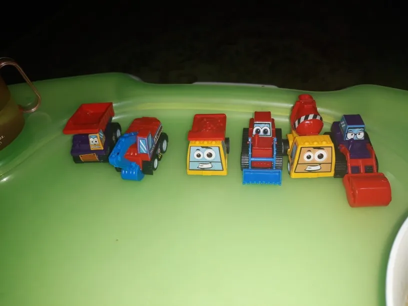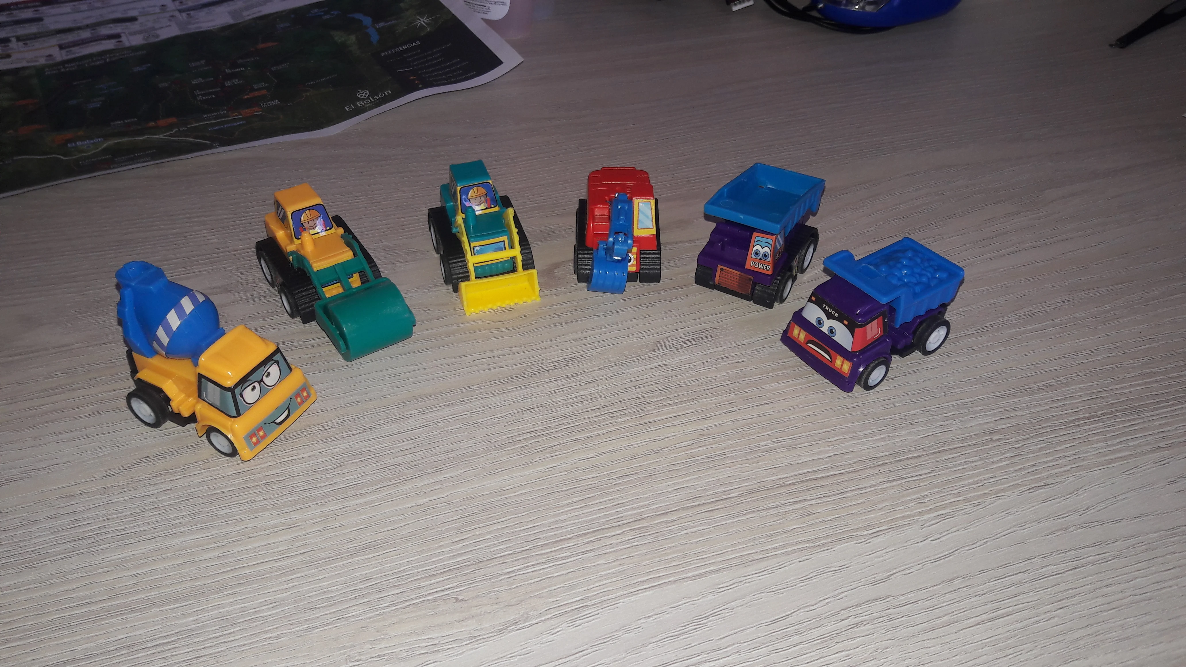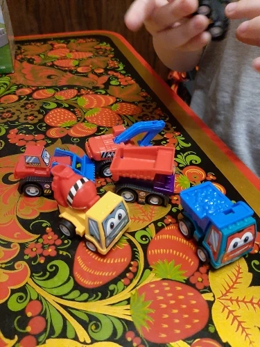 машинки очень маленькие, но нам подошли, удобно брать в дорогу. сын очень доволен, был , когда из получил, не отпускал дня 3. любит играть с ними долго. чехол разорвался в первый день. рабочие детали почти у всех, кроме грузовика с желтвм прицепом и бетономешалкой- из детали без движения. все инерционные.