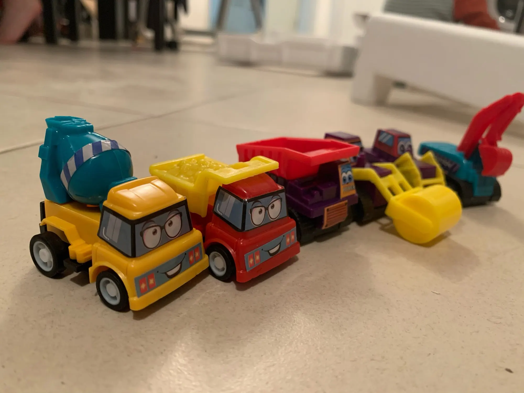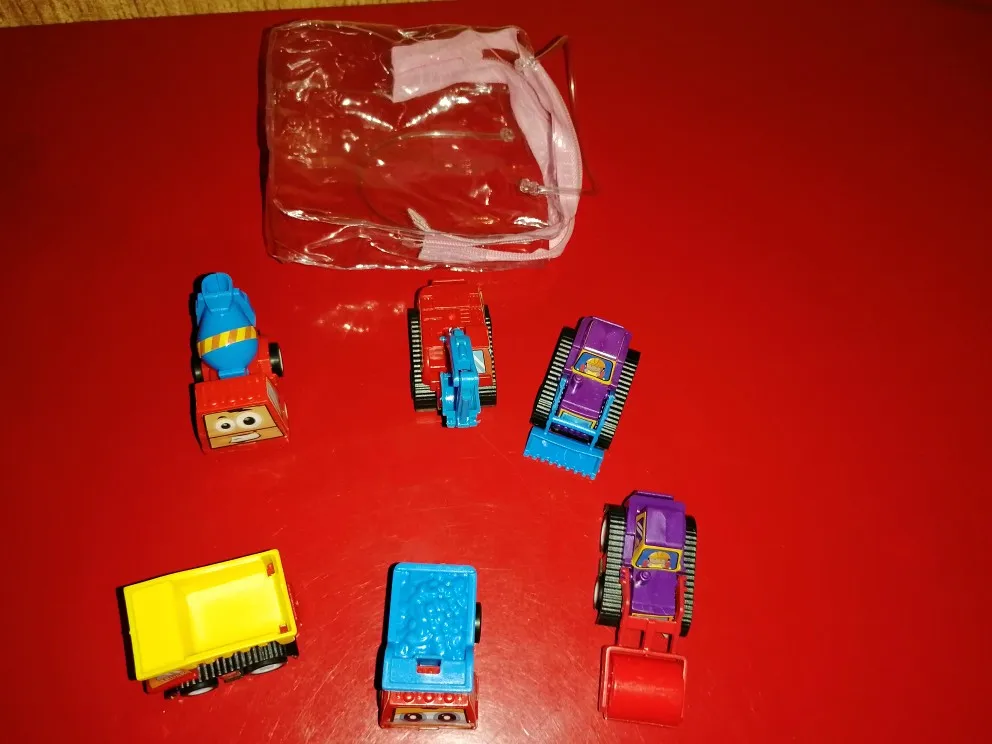 Машинки яркие, все как на картинки, но минусом послужило то, что 2 машинки были поломаны, пришлось клеить самим, а сумочка порвана.