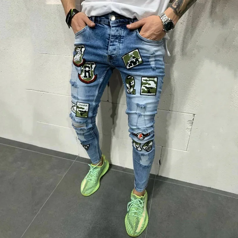 Новинка 2020, мужские эластичные рваные джинсы, брюки с вышивкой, байкерские облегающие потертые джинсовые брюки, Модная Джинсовая одежда для мужчин