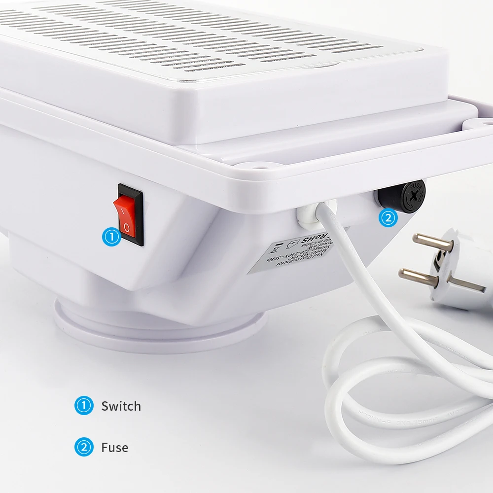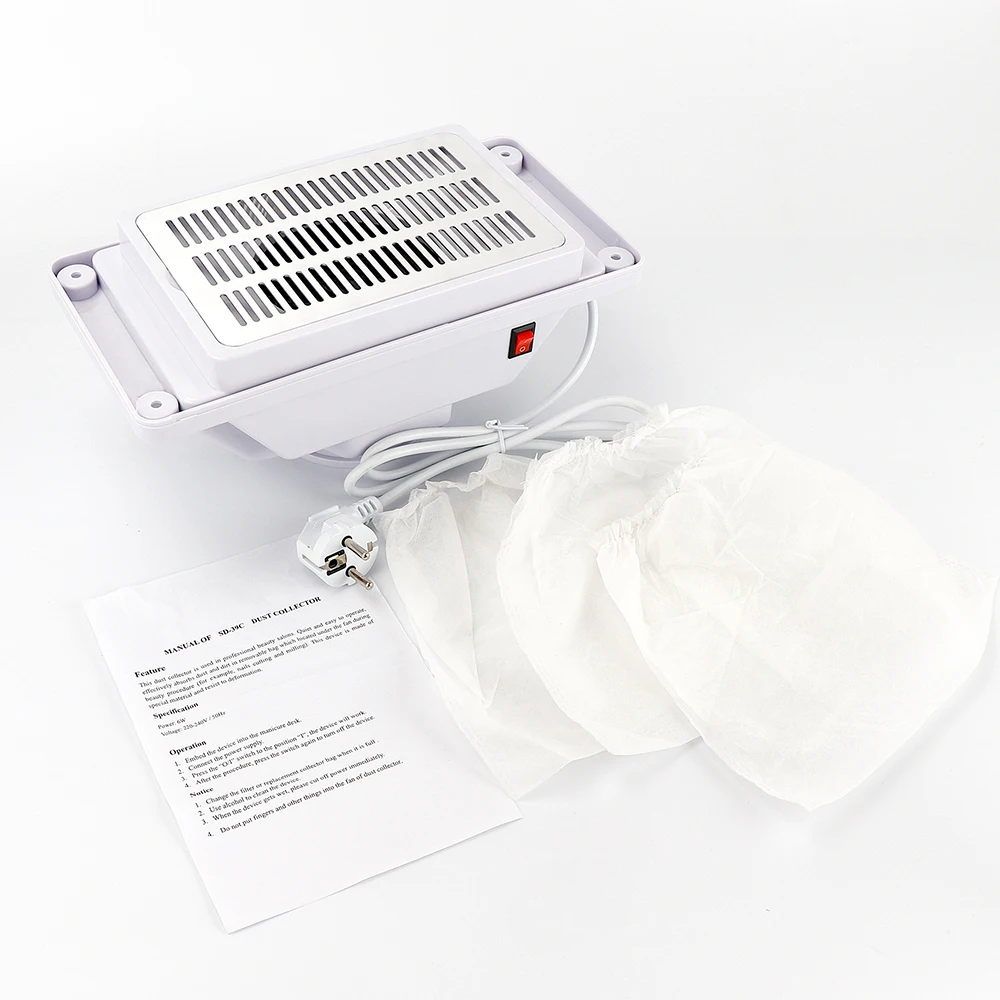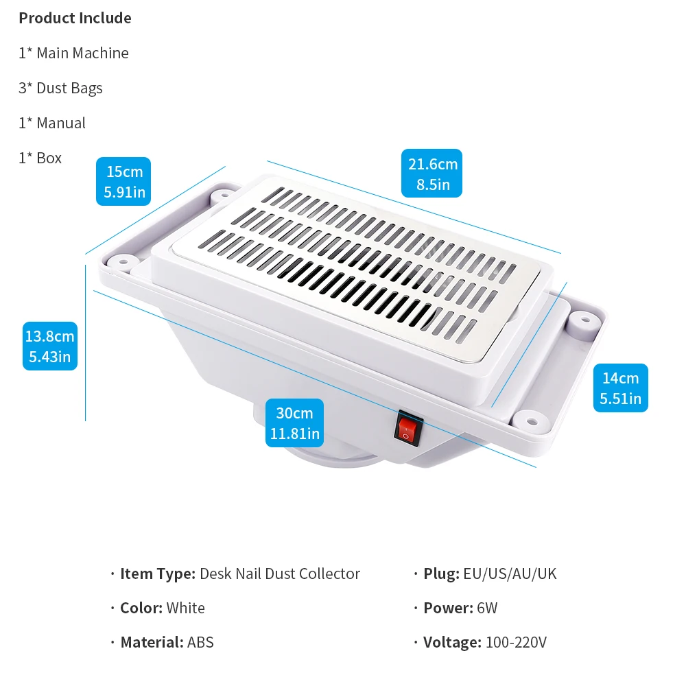 Настольный дизайн. Подходит для ногтевого стола Низкий уровень шума и простота в эксплуатации Мощный вентилятор для сбора пыли, создаваемой во время опиливания или полировки ногтей Посылка входит 3 мешка для пыли, которые можно менять и стирать С мощным и тихим двигателем, удобен в использовании Широко используется в процедурах по уходу за ногтями, таких как полировка/маникюр/наклеивание кончиков ногтей и так далее. Используется в профессиональных салонах красоты, но также может использоваться в домашних условиях.