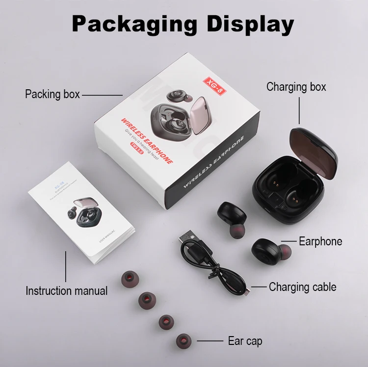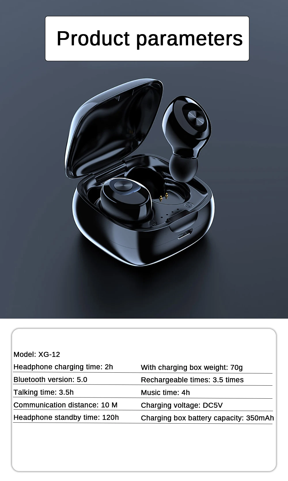Параметры продуктаВерсия Bluetooth: V5.0 + EDRЕмкость аккумулятора:* Наушники: 55 мА* Портативный зарядный чехол: 350 мАчВремя зарядки:* Наушники: 1 час* Портативный зарядный чехол: 2 часаРабочий диапазон: 7-10 метровПрофили Bluetooth: HFP, HSP, AVRCP и A2DPВремя игры: 3-4 часа (после полной зарядки)Время разговора: 3-4 часа (после полной зарядки)Время ожидания: 120 часов (после полной зарядки)Тип аккумулятора: перезаряжаемый литий-ионный полимерный аккумуляторСписки аксессуаров:2 наушника Bluetooth1 * зарядный чехол1 * USB кабель1 * Руководство пользователя3 * амбушюры (размер S,M,L)