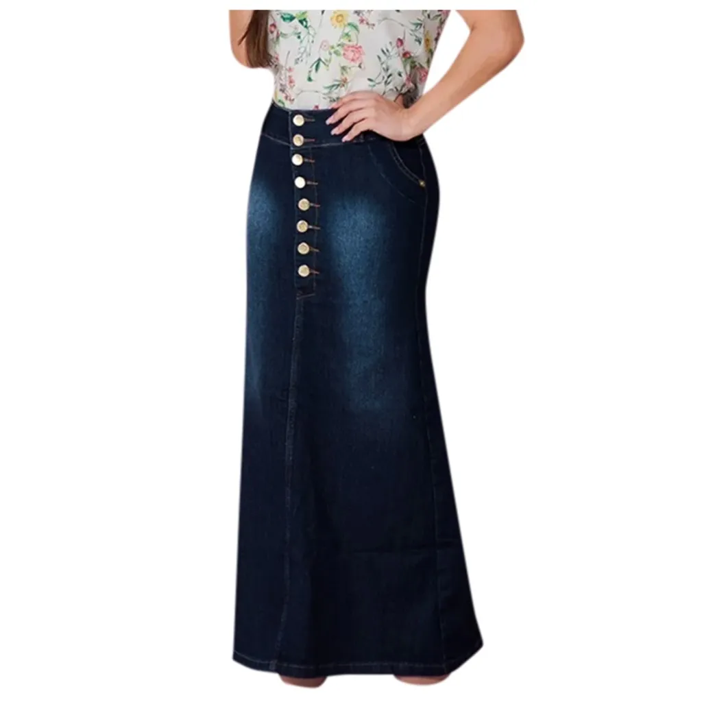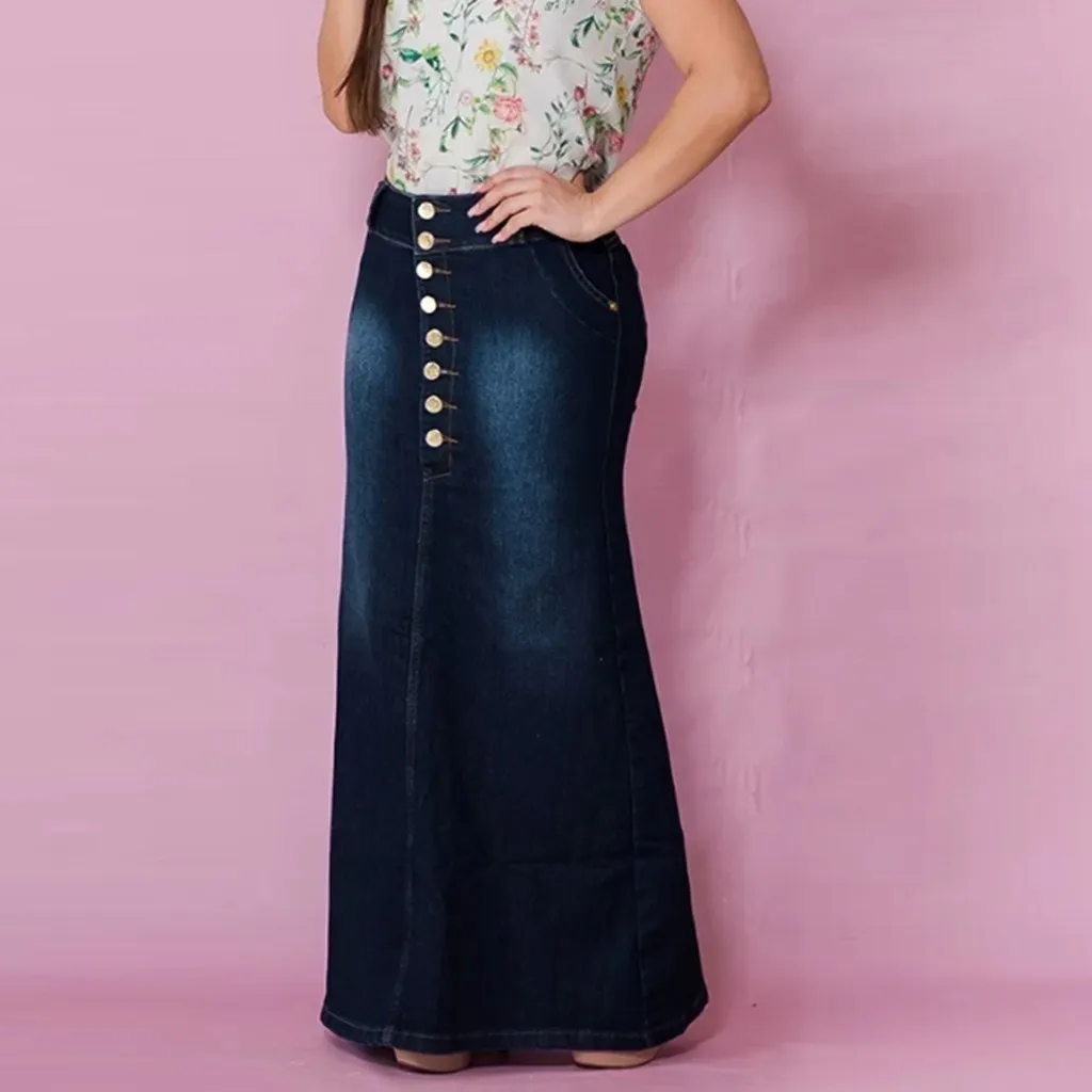 Женская джинсовая юбка, длинная Винтажная летняя юбка с пуговицами спереди, A519, женская Юбка Saia