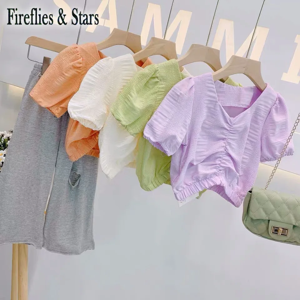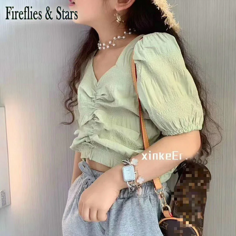 Летняя блузка для девочек, короткая рубашка, детский укороченный топ, Детская уличная одежда, модная плиссированная рубашка с V-образным вырезом и рюшами от 3 до 8 лет