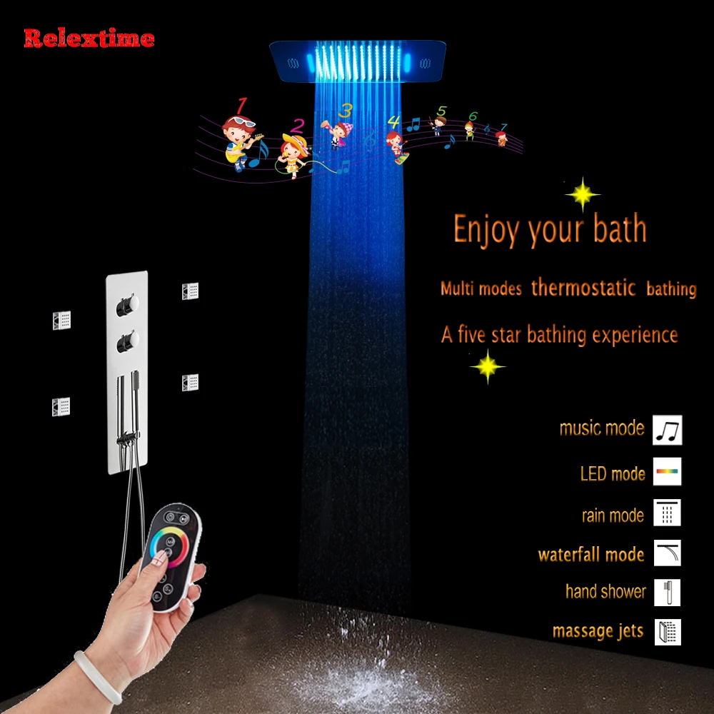Новый стиль concea светодиодный для ванной комнаты набор для душа 4 розетки пути термостатический смеситель с светодиодный встраиваемые потолочный Душ в надутом виде водопада сСоединение BluetoothС массажными струями LF5201