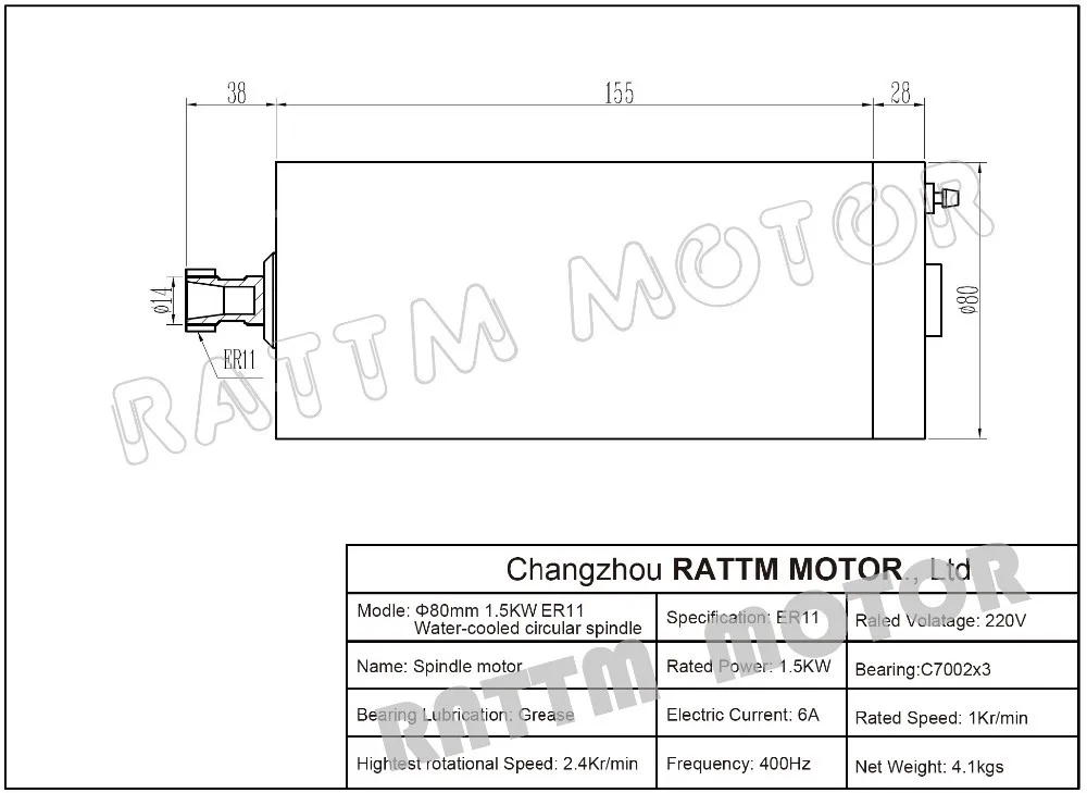 1 х 1,5 кВтER11Двигатель шпинделя с водяным охлаждением(220 В, 400 Гц, 24000 об/мин, 80x188 мм)