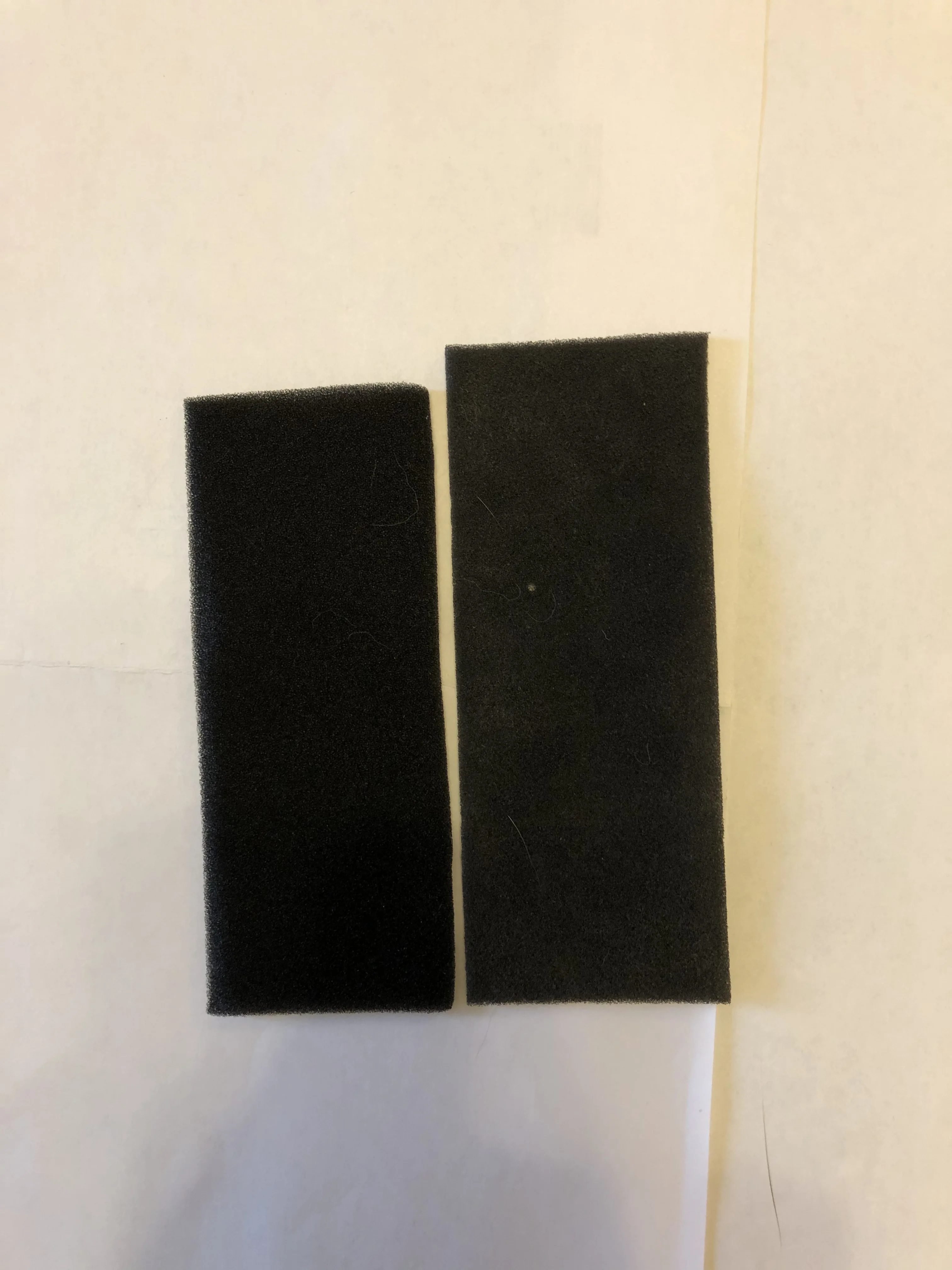 Размеры поролоновых фильтров (которые чёрные) не соответствуют размерам стандартного фильтра Tefal (который входил в комплект пылесоса при покупке). Один фильтр больше, второй меньше. Справа, на фотографии, стандартный поролоновый фильтр, из комплекта пылесоса, который был установлен на заводе-изготовителе. Стоит обратить внимание на кривую линию реза, которая не параллельна заводскому фильтру.