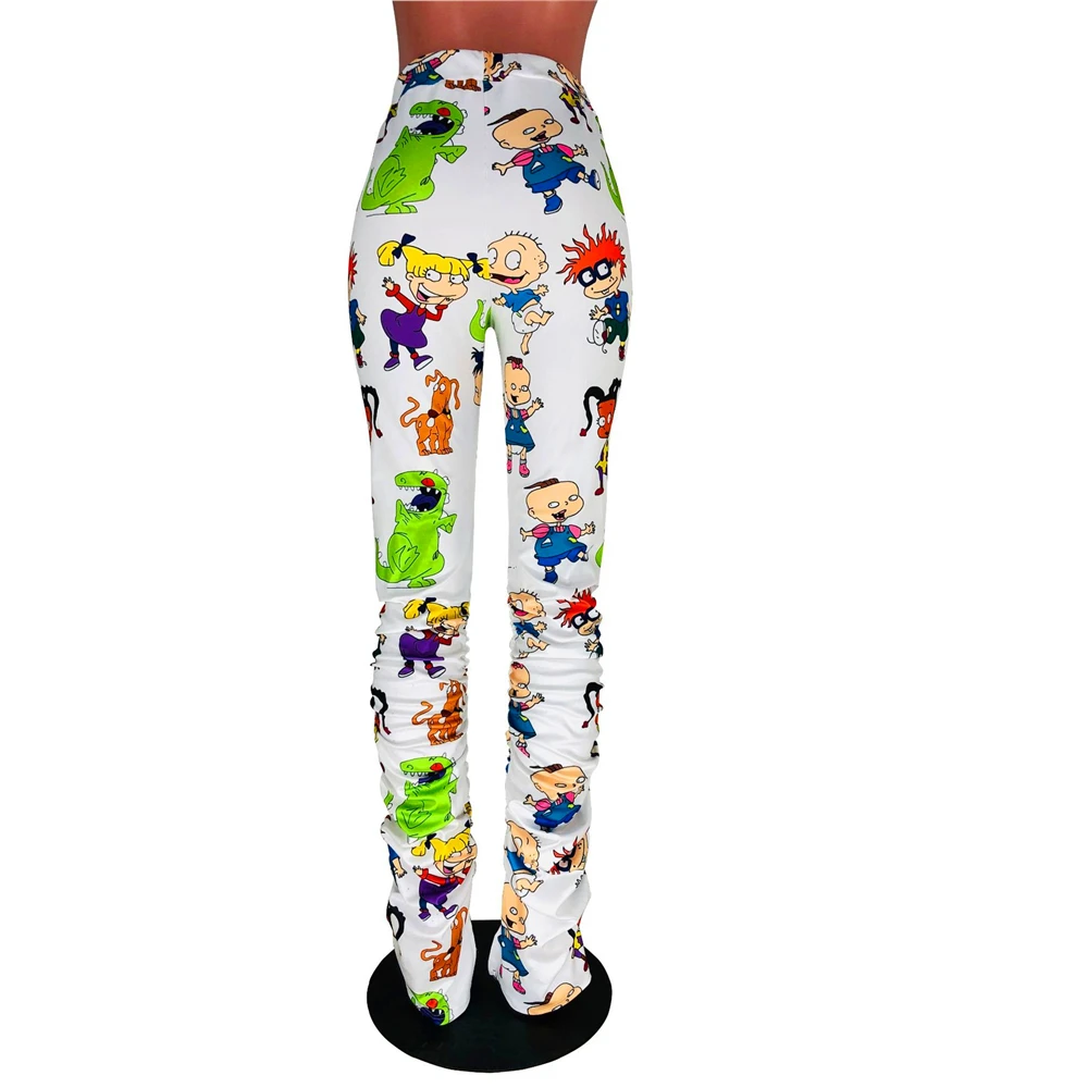 Женские спортивные штаны с рюшами и высокой талией с мультяшным принтом, эластичные летние леггинсы со складками, расклешенные брюки с расклешенным подолом, 2021