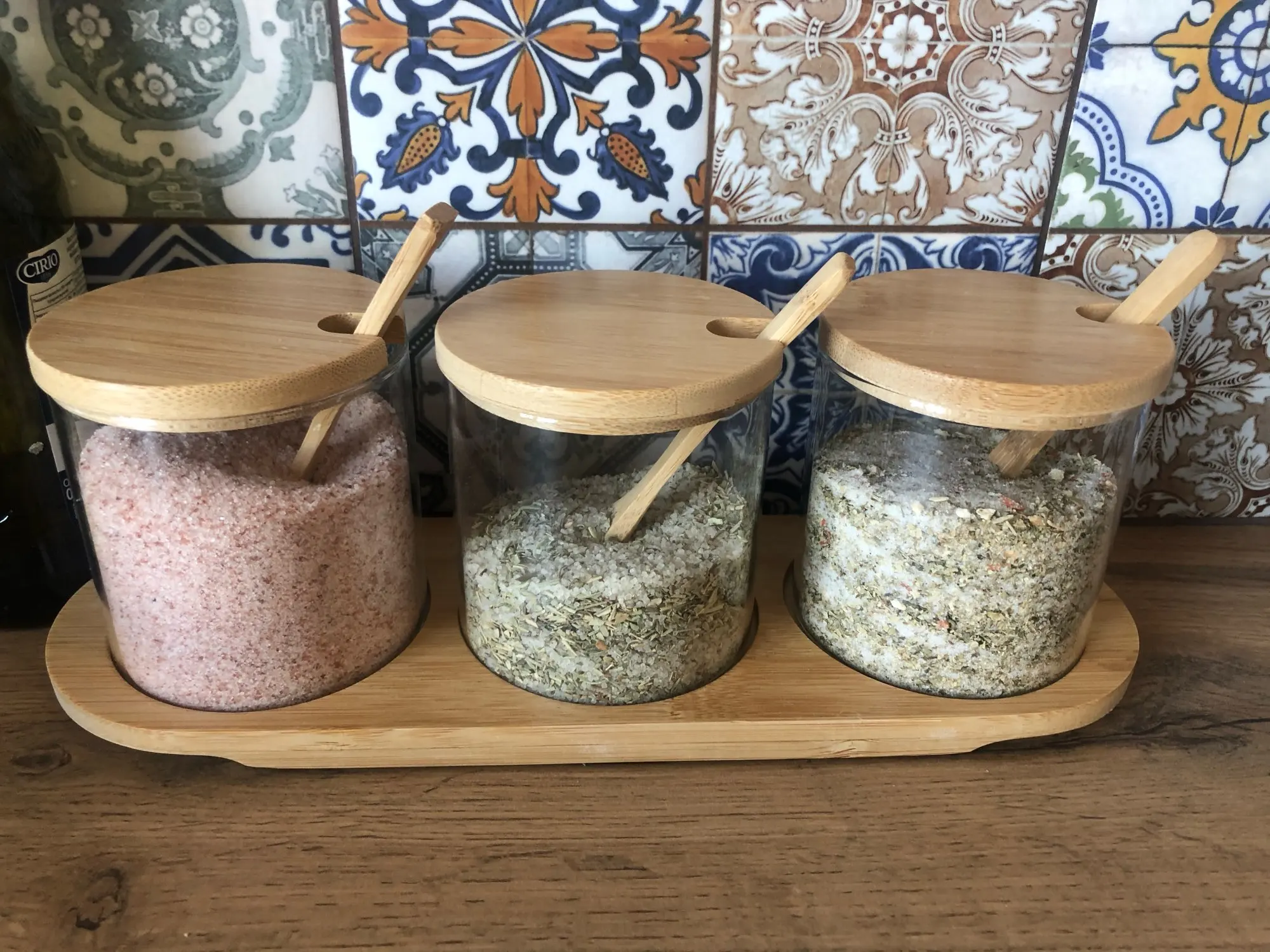 Отличное качество баночки для приправ. Стеклянная бутылка оснащена деревянной крышкой, деревянной ложкой и деревянным подносом. Легко и удобно класть специи. Очень красиво для украшения кухни. Коробка для специй хорошо упакована, и доставка быстрая.