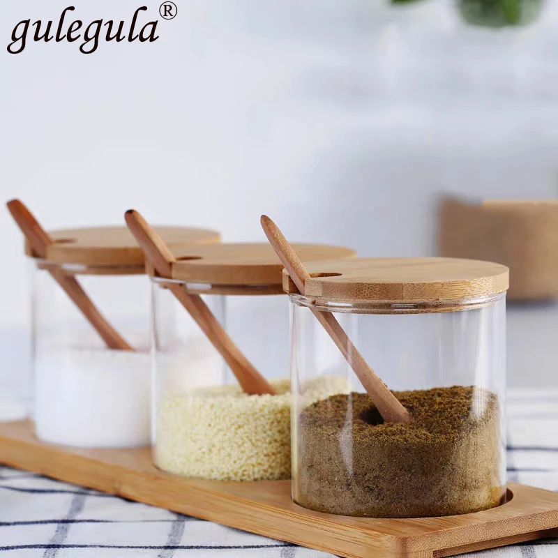 Кухонный инструмент для специй, стеклянная бутылка, баночка для хранения сахарной соли, баночка для специй с деревянными аксессуарами ложки, кухонные принадлежности, Полка для специй