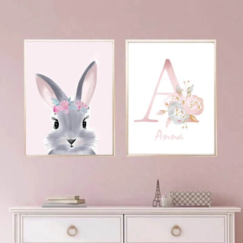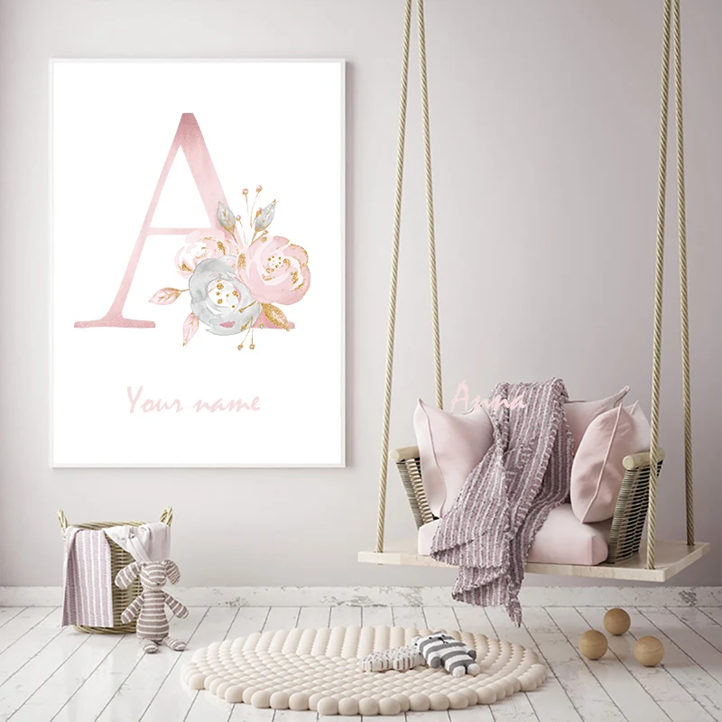 Подарочная картина для детской комнаты для маленьких девочек, Картина на холсте с именем девочки, цветочные цветы, розовое искусство, Настенный декор