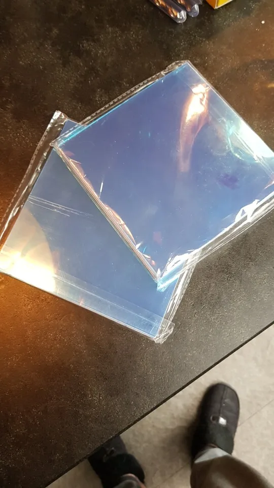 Отличные зеркальные квадраты. Гибкие (материал типа толстой фольги), легко резать ножницами, дают яркое четкое отражение с полной иллюзией зеркала (вблизи), имеют клеящий слой. Покупала, чтобы заменить испорченные части акриловой зеркальной мозаики (пыталась приклеивать акрил клеем Момент Кристалл и он их разъел). Из этих квадратов вырезала нужные мне элементы и вклеила в мозаику - никаких отличий! Однако резать лучше чем-то типа ланцета, поскольку ножницы при вырезании сложных фигур все же искривляют зеркальную поверхность и издалека изображение искажается. На фото части, вырезанные из квадратов, имеют синий цвет (сверху пленка). Первое время имели сильный химический запах, который потом пропал.