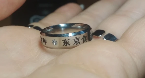 качество хорошее!! надпись на китайском : токийский гуль ( по обе стороны от камушка) . с продавцом не общался, пришло очень быстро.