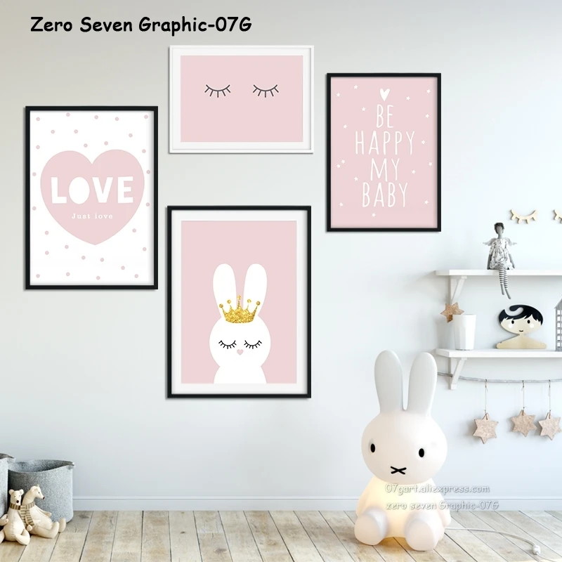 Настенный холст для детской комнаты, постер с розовым мультяшным Кроликом, блестящая корона, Банни, декоративная картина, скандинавский декор для детской комнаты