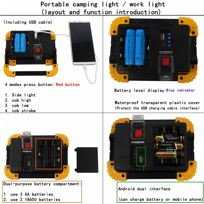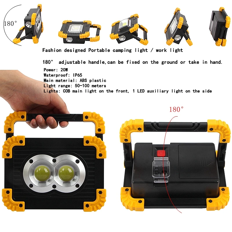 Ручка, вращающаяся на 180 °, можно закрепить на земле или взять в руки. USB-кабель может заряжать аккумулятор, аккумулятор может подавать питание лампе, а также может заряжать мобильный телефон в аварийной ситуации.