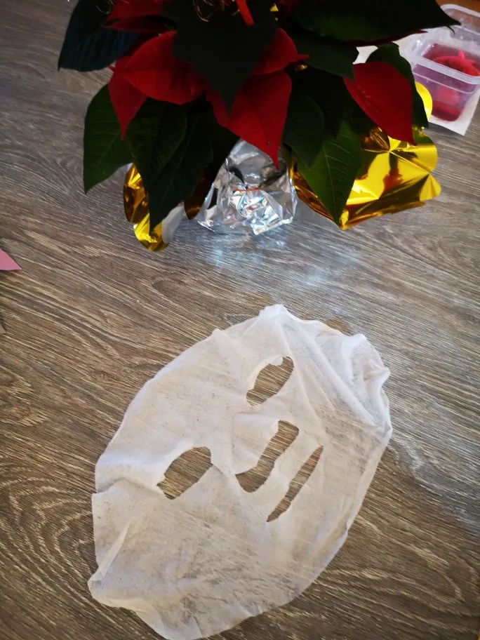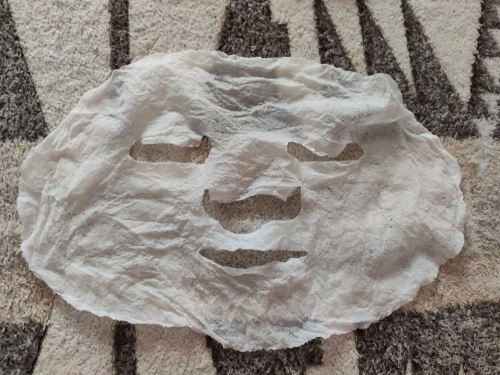 Ожидала, что будет готовая маска, но это лишь тканевая основа. Маска спрессована в небольшие "таблетки", быстро расправляется при намокании. Оказалась больше моего лица и с маленькими прорезями для глаз В целом понравилась