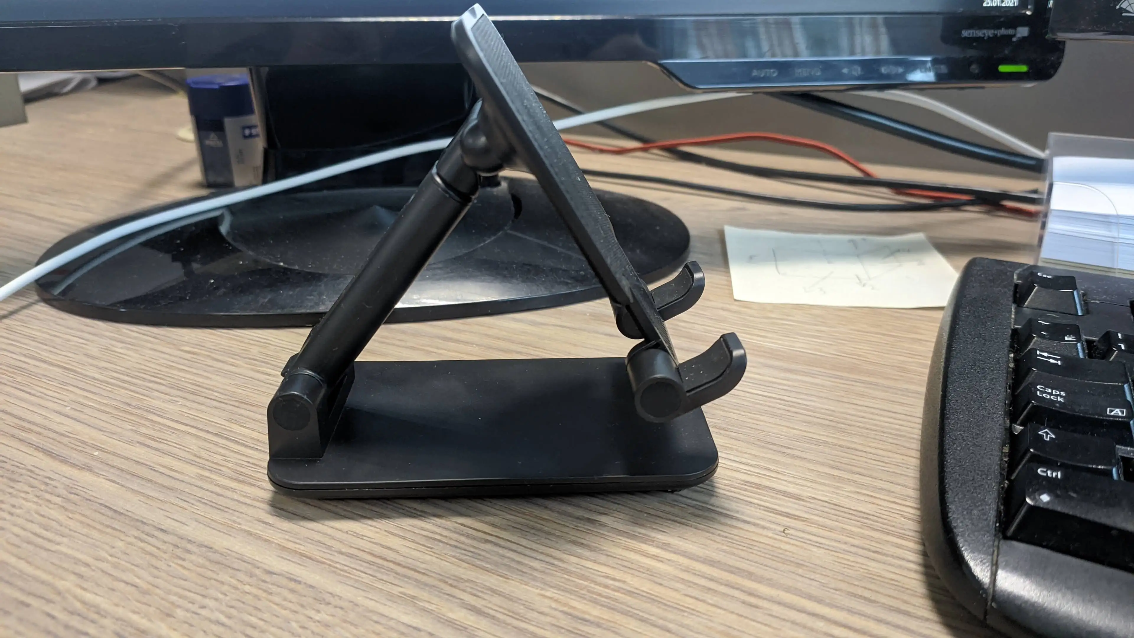 Почему я раньше не думал об этом держателе телефона? Идеально подходит для встреч с зумом. Я рекомендую этого продавца. Не сомневайтесь на секунду. Даже с корпусом аккумулятора и кольцом моего телефона, он хорошо держит.