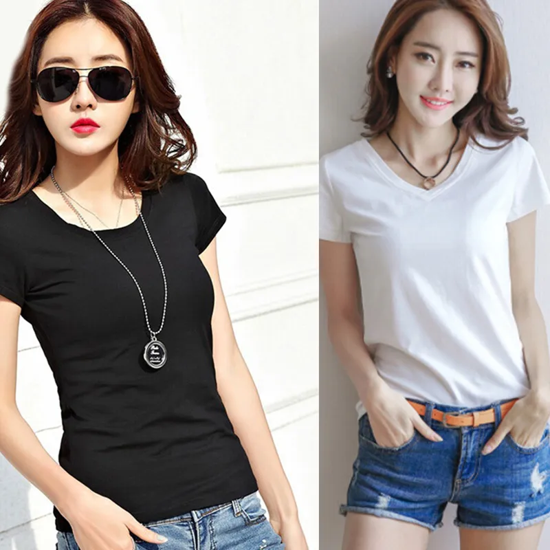 Новая женская хлопковая футболка Лето 2020 г. Повседневная эластичная футболка с короткими рукавами и v-образным вырезом с тонким низом Топы для девочек Футболки женские