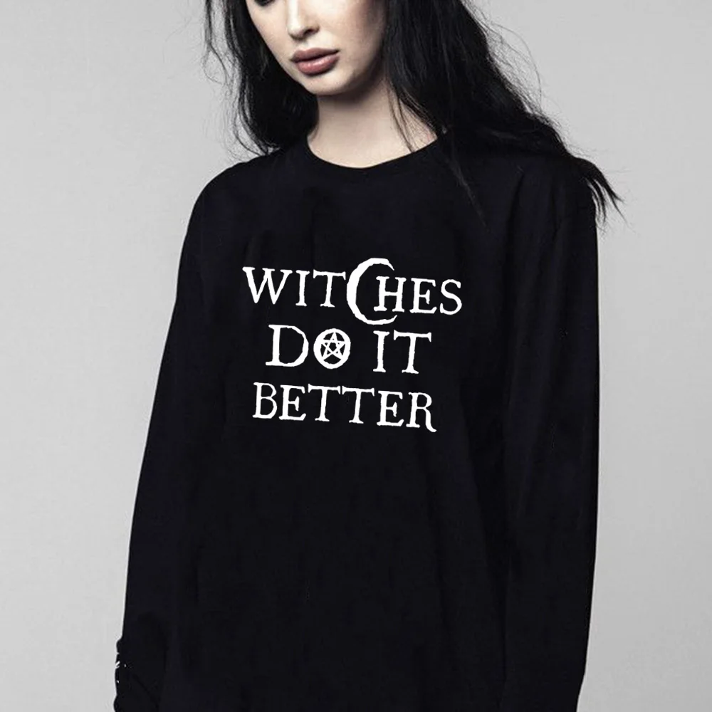 Ведьмы делают его наилучшим образом на молнии с надписями в стиле Харадзюку для женщин Черная толстовка с капюшоном и длинными рукавами, свитшот с круглым вырезом Повседневная Tumblr женские топы